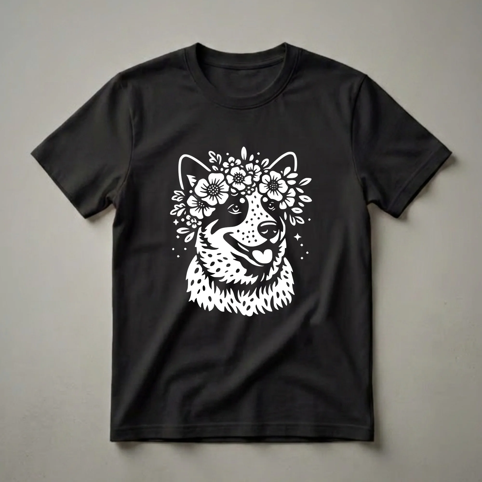 Australian Cattle Dog moms and dads who appreciate unique artistry will reach for this eye-catching graphic tee. The design features a striking white stencil-style illustration of an Australian Cattle Dog, its head adorned with a vibrant crown of flowers. This breed, also known as the Blue Heeler or Red Heeler, is renowned for its intelligence, energy, and unwavering loyalty, making it a cherished companion for active families. The intricate floral arrangement around the dog's head adds a touch of bohemian charm, contrasting beautifully with the breed's rugged nature. This shirt is a thoughtful gift for any Australian Cattle Dog owner who wants to display their affection for their spirited canine friend. It's a perfect wear for casual outings, dog park visits, or simply relaxing at home with your beloved pet. The detailed linework and the contrast between the dog's speckled fur pattern and the delicate blossoms create a visually appealing statement piece for any dog lover's wardrobe. This t-shirt celebrates the special bond between humans and their Australian Cattle Dogs, offering a stylish way to express your passion for this remarkable breed.