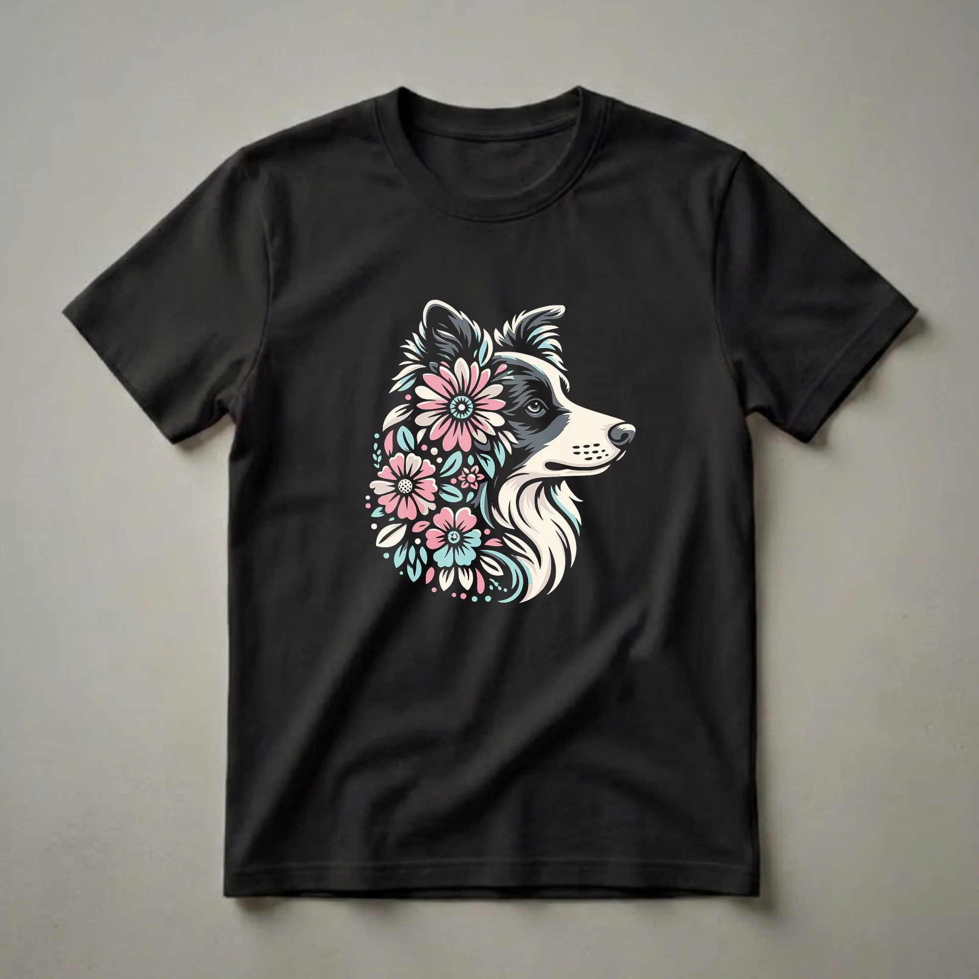 - This intelligent Border Collie floral face tee celebrates canine companionship with artistic flair.