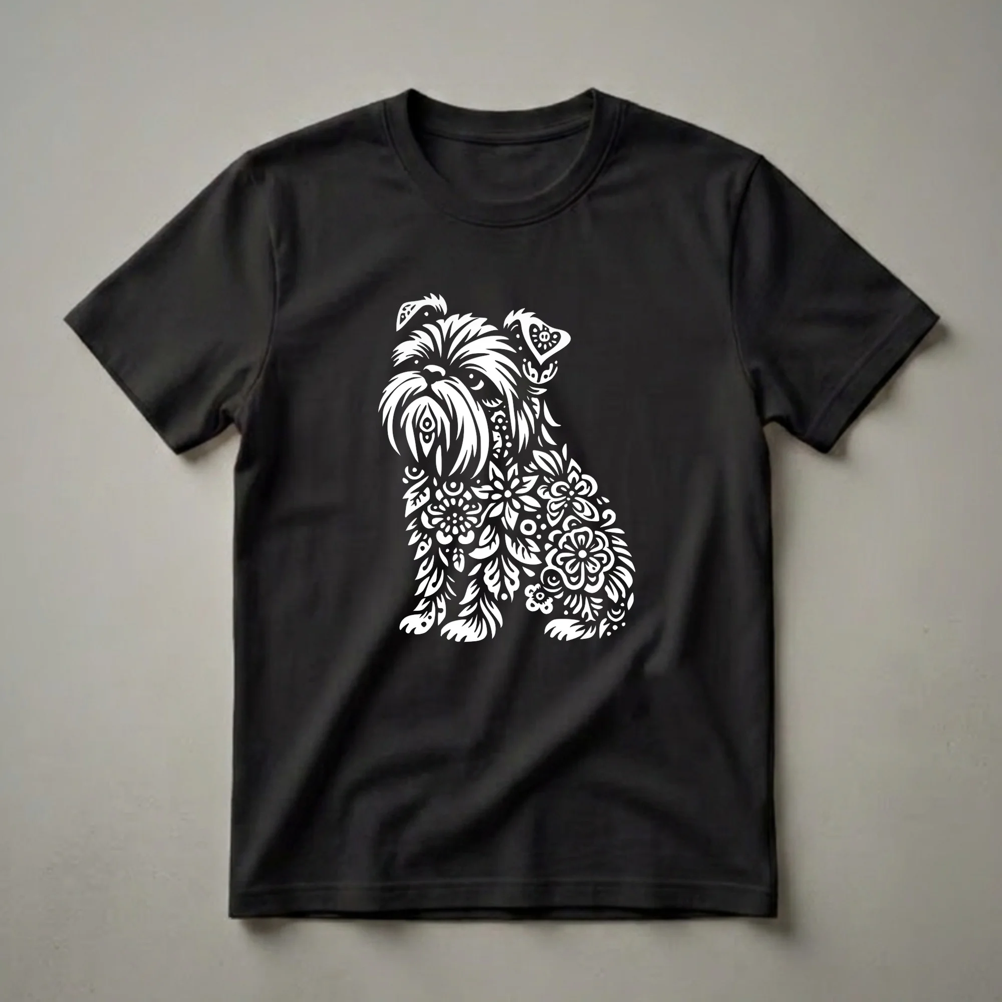 Brussels Griffon owners who appreciate unique artistry will adore this striking graphic tee. The design features a Brussels Griffon rendered entirely in intricate white floral and paisley patterns, creating an eye-catching silhouette against a dark background. This Brussels Griffon, known for its distinctive facial features and affectionate nature, is depicted in a seated pose, its form beautifully filled with blooming flowers, swirling leaves, and decorative motifs. The Brussels Griffon breed, originating from Belgium, was historically favored by royalty and is recognized for its alert and curious personality. This shirt is a wonderful way for any dog mom or dog dad to express their affection for their companion. It makes a thoughtful gift for birthdays, holidays, or just because for the Brussels Griffon enthusiast in your life. Wear this unique t-shirt to dog park visits, casual outings, or while relaxing at home with your beloved pet. This apparel is a true conversation starter.