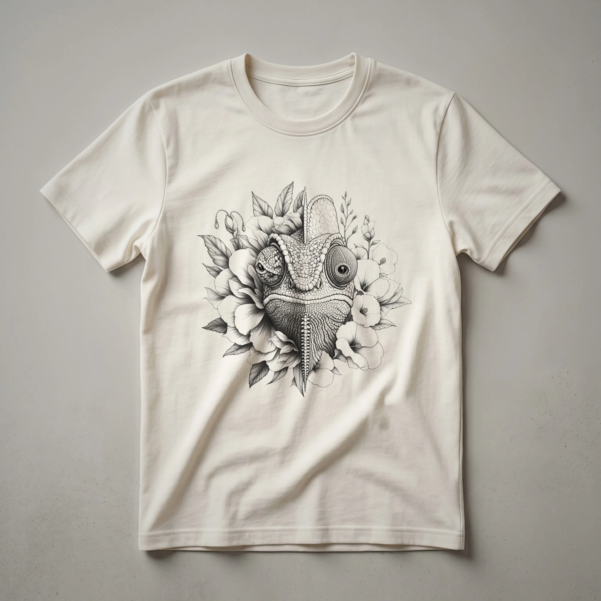 - This reptilian graphic tee features a chameleon face intertwined with vibrant floral patterns.