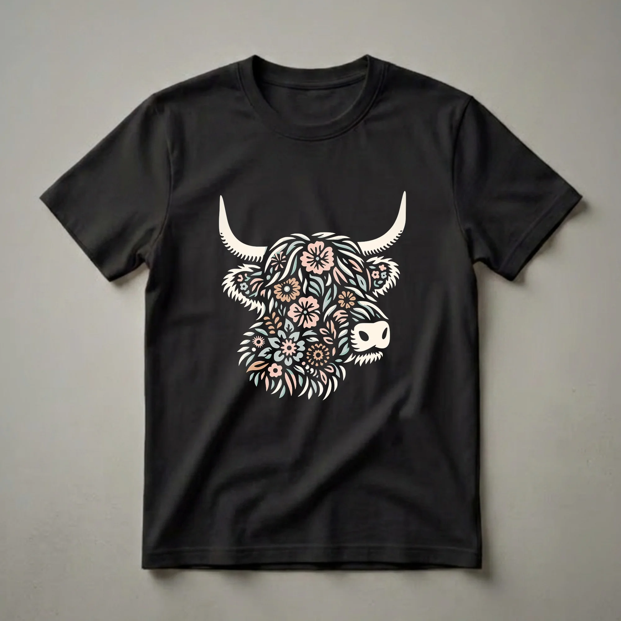 Nature lovers and fans of unique wildlife art will appreciate this striking graphic tee featuring a Scottish Highland cow. The design artfully constructs the iconic bovine head using a delicate arrangement of pastel-colored flowers and leaves in shades of blush pink, mint green, and cream, set against a solid black background. This artistic interpretation highlights the gentle nature of these shaggy creatures, known for their distinctive long horns and thick, wavy coats that help them thrive in the rugged Scottish Highlands. Highland cattle are a heritage breed, originating from the Scottish Highlands and Islands, and are celebrated for their hardiness and calm temperament. This t-shirt is a thoughtful gift for anyone who cherishes the beauty of the countryside or has a special fondness for these majestic animals. It's a go-to tee for casual outings, nature walks, or simply relaxing at home, offering a blend of artistic flair and appreciation for the natural world. Wear this shirt to express your connection to the wild and your admiration for the enduring charm of the Highland cow.