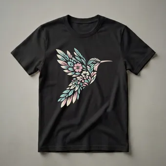 Hummingbirds, known for their rapid wing beats and vibrant plumage, are a delight to observe in their natural habitats. This striking graphic tee captures the essence of these tiny marvels, with a hummingbird design intricately formed from delicate floral and leaf patterns. The art features soft pastel colors, blush pink, pale blue, and cream, creating an eye-catching visual that stands out against the dark background. Hummingbirds are vital pollinators, playing a crucial role in the ecosystems they inhabit, often found flitting among flowers in gardens and forests. This shirt is a thoughtful gift for women who appreciate the beauty of wildlife and the intricate details of nature. It's a go-to tee for casual outings, nature walks, or simply relaxing at home while celebrating your passion for these enchanting birds. Wear this unique t-shirt to express your connection to the natural world and its delicate inhabitants. The intricate floral details add an artistic touch, making this apparel a conversation starter.