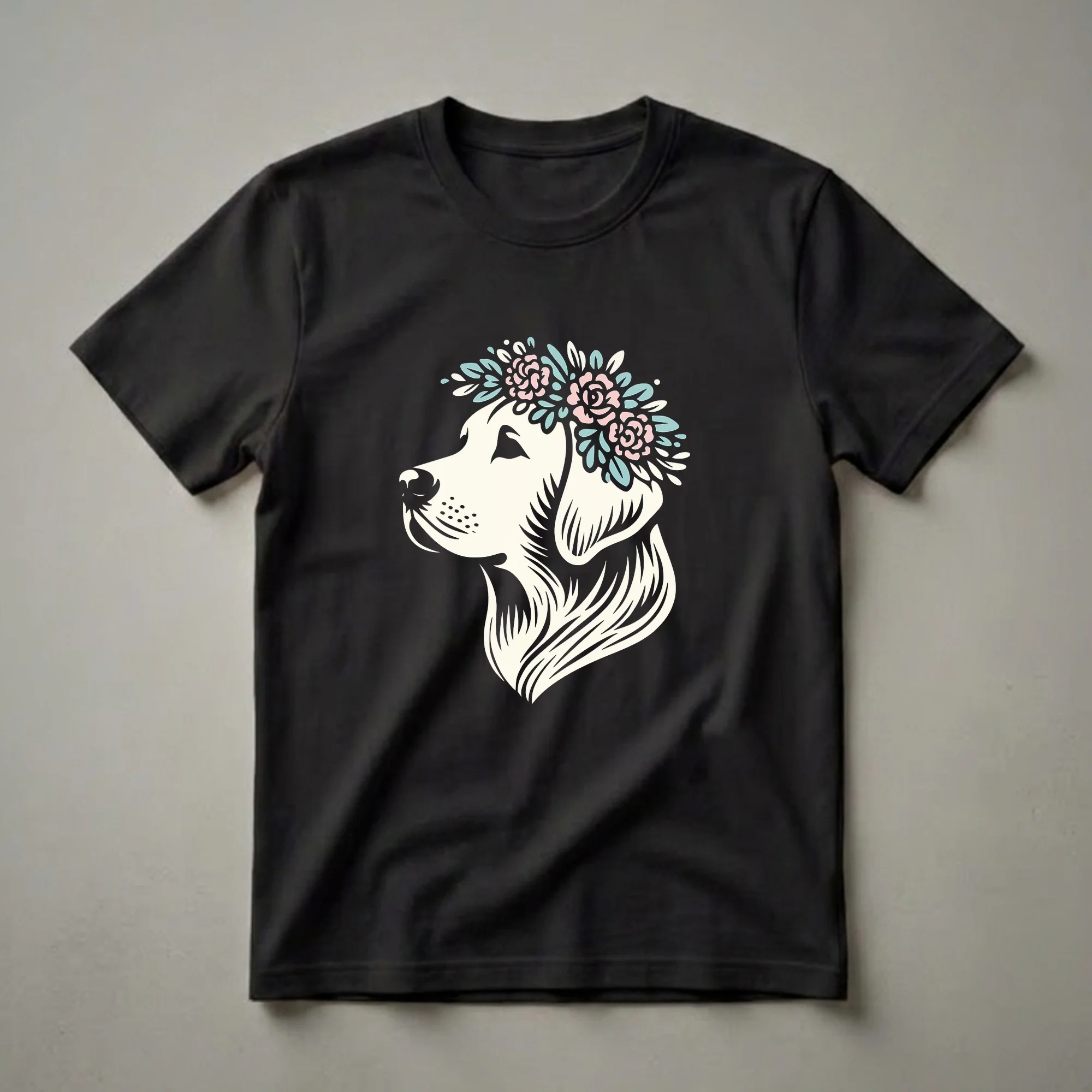 - A beautiful floral crown adorns the head of this Labrador Retriever graphic tee.