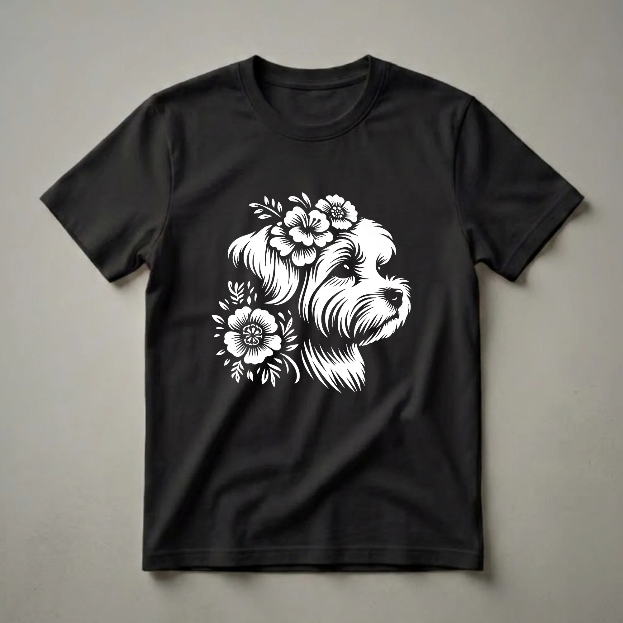 Maltese dog moms and dads who want to wear their affection on their sleeve will adore this striking graphic t-shirt. The design features a detailed, white stencil-style illustration of a Maltese dog's head, complete with its characteristic fluffy fur. Adorning the dog's head and neck are delicate floral elements, including blooming flowers and leafy branches, adding a touch of natural beauty to the canine portrait. This shirt is a wonderful way for any Maltese owner to express their bond with their beloved pet. It makes a thoughtful gift for birthdays, holidays, or just because for the dog lover in your life. Wear this unique tee to the dog park, on casual outings, or while relaxing at home with your furry friend. This graphic tee is a staple for any dog enthusiast's wardrobe, celebrating the joy that Maltese dogs bring.