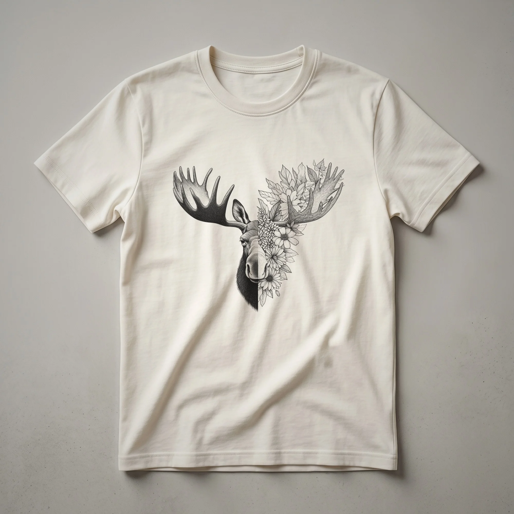Nature enthusiasts and wildlife admirers will reach for this eye-catching t-shirt featuring a beautifully rendered moose. The design showcases a moose's head, intricately adorned with delicate floral elements, rendered in a soft watercolor style. This artistic interpretation brings a touch of the wild into your wardrobe, blending the majestic presence of the moose with the gentle beauty of blooming flowers. Moose, the largest members of the deer family, are iconic inhabitants of northern forests across North America and Eurasia, often found near lakes and rivers. This graphic tee is a wonderful way for women and girls to express their connection to the natural world. It makes a thoughtful gift for anyone who cherishes the outdoors, hiking, or simply admires the serene beauty of woodland creatures. Wear this shirt on your next nature walk, to a casual outing with friends, or simply when you want to carry a piece of the wilderness with you.