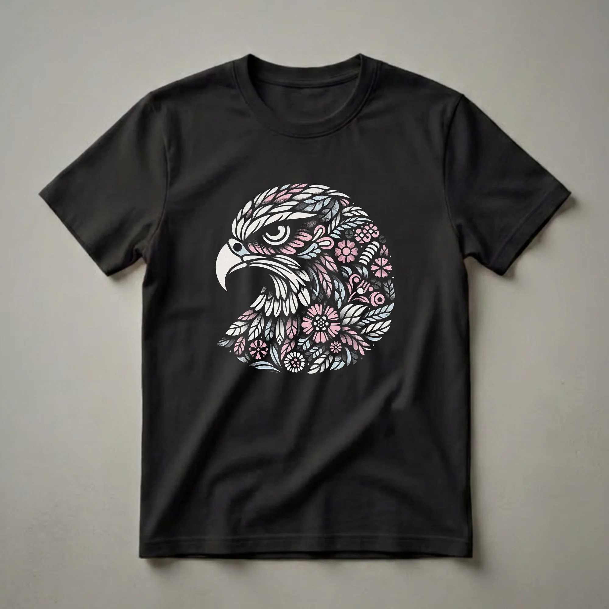 Wildlife enthusiasts and bird watchers will appreciate this striking graphic tee featuring a peregrine falcon rendered in a beautiful floral art style. The design intricately weaves together feathers, leaves, and delicate flowers in soft pastel hues of pink, blue, and white, creating an eye-catching silhouette against the black background. Peregrine falcons, known for their incredible speed and agility, are the fastest animals on Earth, capable of reaching speeds over 200 miles per hour during their hunting dives. This unique t-shirt is a thoughtful gift for anyone who admires these magnificent birds of prey. It's a staple in the collection for nature lovers, great to wear on hikes, to birdwatching events, or simply as a conversation starter. This shirt celebrates the beauty of wildlife with an artistic touch, making it a go-to tee for expressing your passion.