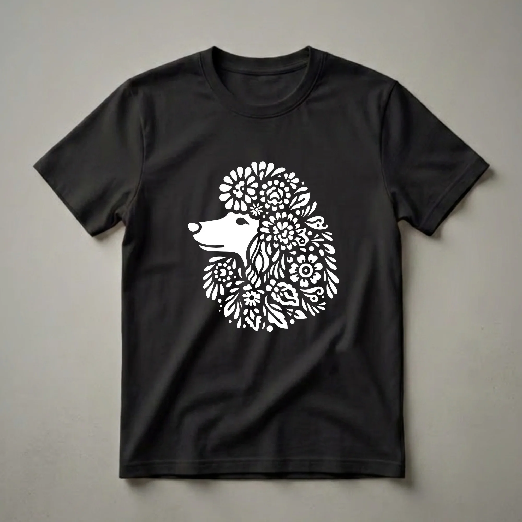 Poodle owners who appreciate artistic flair will adore this striking graphic tee. The design features a stylized poodle head, its iconic fluffy mane transformed into an intricate arrangement of white flowers and leaves. Each bloom and petal is rendered with delicate detail, creating a visually captivating silhouette against the dark background. Poodles, known for their intelligence and elegant appearance, are a beloved breed, and this artistic interpretation captures their charm beautifully. This shirt works well for anyone who cherves their canine companion, especially those who own or admire poodles. It makes a thoughtful gift for a dog mom or dad who wants to display their affection for their four-legged family member. Imagine wearing this eye-catching t-shirt to a dog park meet-up or a casual brunch with fellow dog enthusiasts. It’s a unique way to express your passion for your poodle, blending fashion with your love for dogs. This comfortable tee is a staple for any dog lover's wardrobe, offering a distinctive style that stands out.