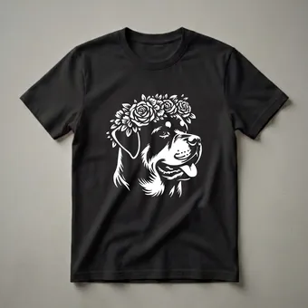 - Features a detailed Rottweiler head with a floral crown.