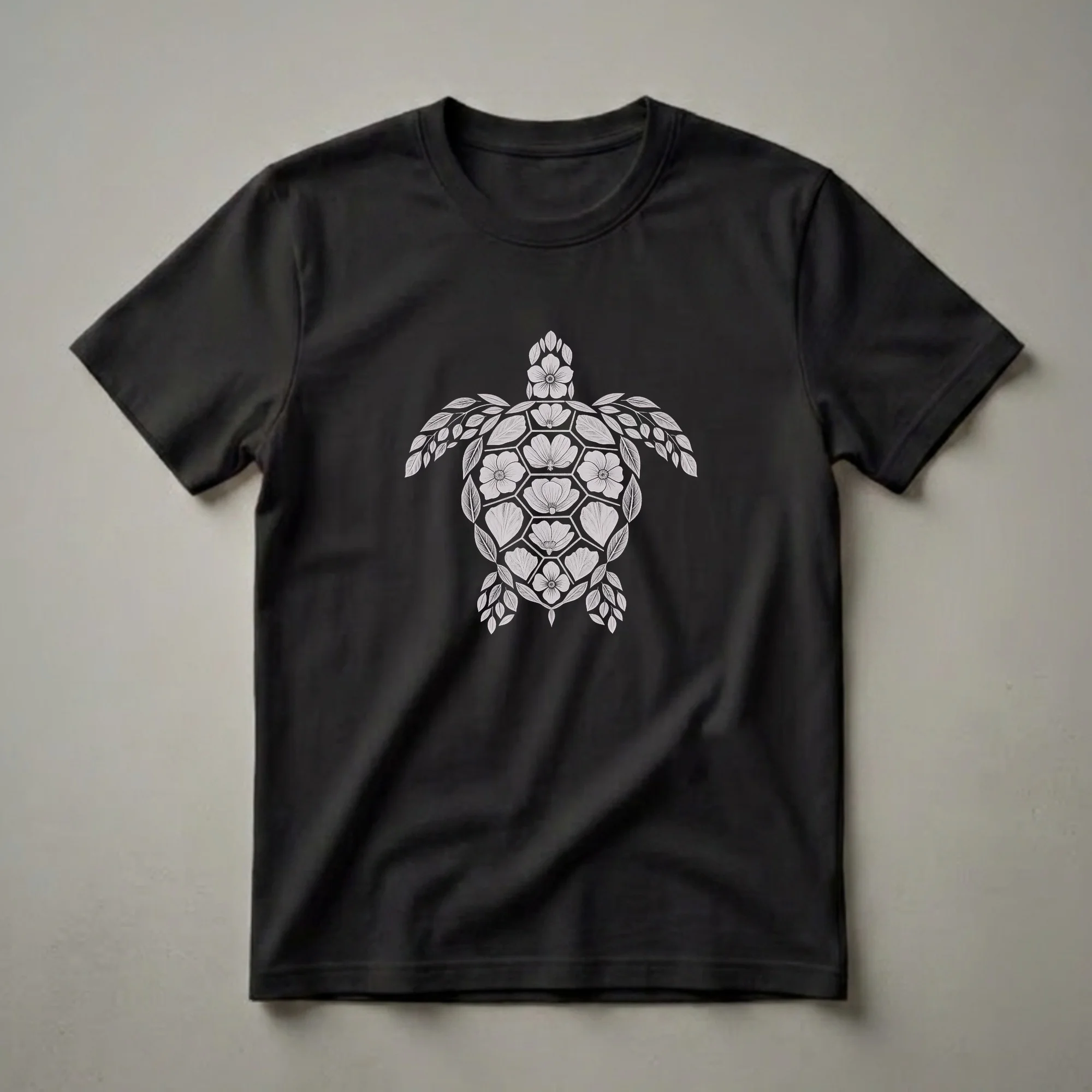 Nature lovers and ocean conservationists will appreciate this striking graphic tee featuring a sea turtle artfully constructed from delicate floral and leaf motifs. The intricate design showcases a sea turtle silhouette filled with blooming flowers and detailed leaves, all rendered in a monochromatic style against a solid black background. This artistic representation highlights the beauty of marine life and the natural world. Sea turtles are ancient mariners, navigating vast oceans and playing a crucial role in maintaining the health of marine ecosystems. They are known for their long migrations and their importance in keeping coral reefs and seagrass beds healthy. This t-shirt is a thoughtful gift for anyone who cherishes the ocean's wonders or admires the intricate beauty of botanical art. It's a go-to tee for casual outings, beach trips, or simply relaxing at home while celebrating your connection to the sea. Wear this shirt to express your appreciation for these magnificent creatures and the delicate balance of nature.