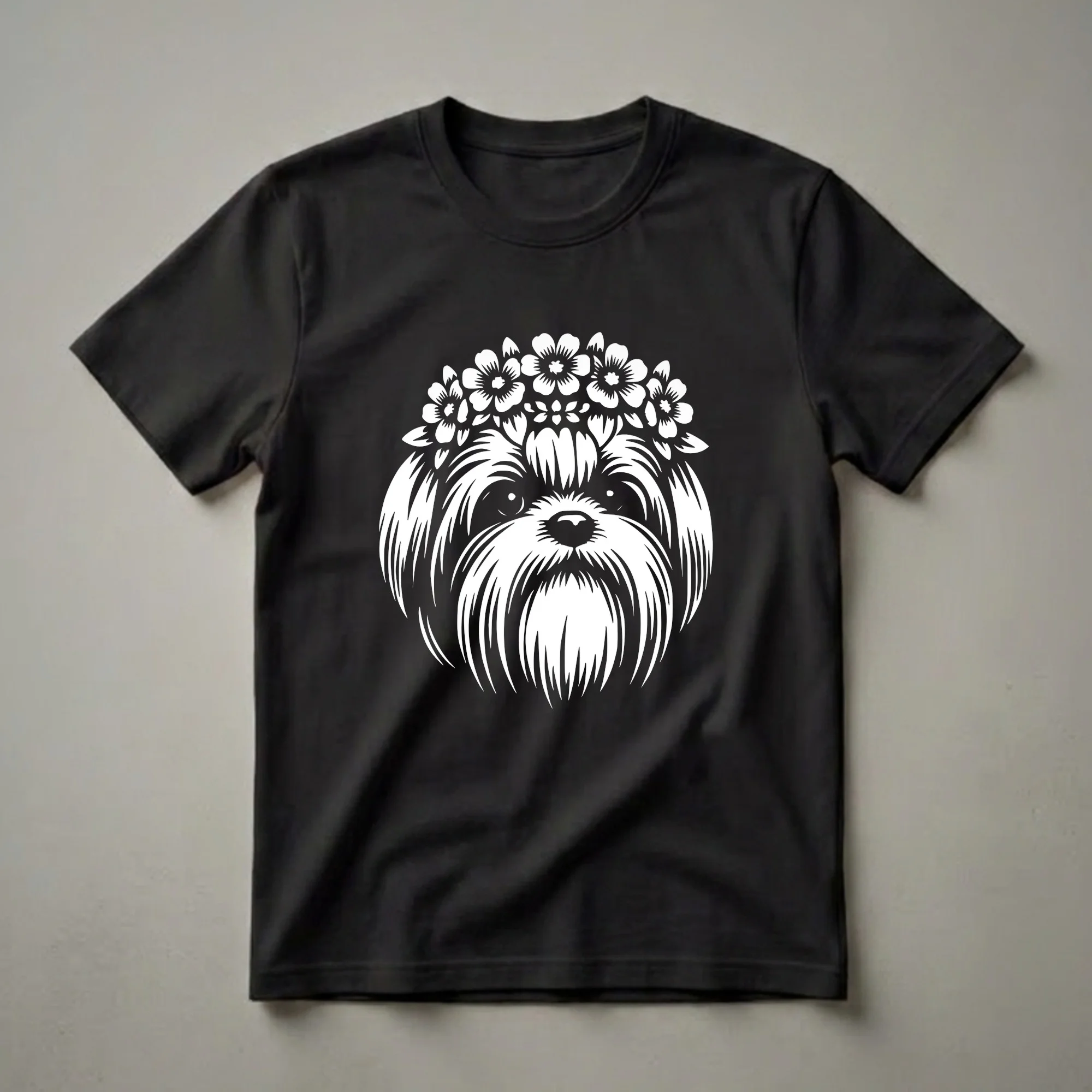 Shih Tzu moms and dads who want to wear their affection for their beloved companions will reach for this eye-catching graphic tee. The design features a stylized white silhouette of a Shih Tzu's face, complete with its signature long, flowing fur. Adorning the dog's head is a delicate crown of flowers, adding a touch of whimsical charm. Shih Tzus, originally from Tibet and developed in China, are known for their affectionate and outgoing personalities, making them cherished family pets. This shirt is a thoughtful gift for any Shih Tzu owner, celebrating the unique bond they share with their small, spirited dog. It's a wonderful way to express your passion for the breed, whether you're heading to a dog park, running errands, or enjoying a casual day out. This t-shirt is a staple in the collection for anyone who considers their Shih Tzu a true member of the family. The striking graphic stands out, making it a conversation starter among fellow dog enthusiasts.