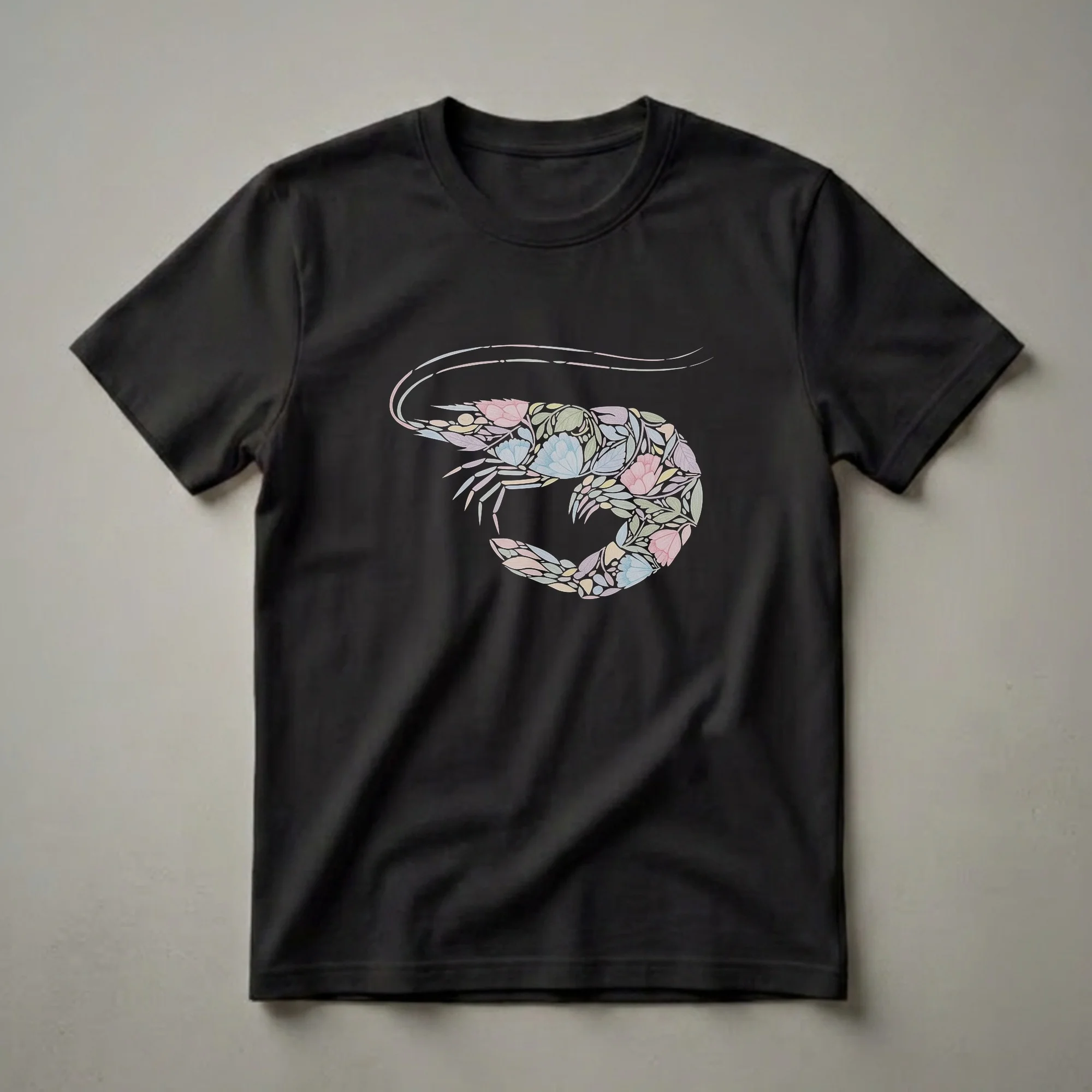 Marine life enthusiasts and lovers of unique art will appreciate this striking t-shirt featuring a beautifully rendered shrimp. The entire silhouette of the crustacean is intricately filled with a delicate pattern of pastel-colored flowers and leaves, creating an eye-catching visual that blends the natural world with artistic flair. This design captures the elegance of the shrimp, from its segmented tail to its antennae, all rendered in soft hues of pink, blue, green, and yellow. Shrimp are decapod crustaceans found in all the world's marine and brackish environments. They are an important part of the food chain and a popular seafood choice globally. This tee works well for anyone who appreciates the beauty of the ocean's inhabitants or enjoys a touch of botanical art. It makes a thoughtful gift for a marine biologist, a seafood chef, or someone who simply loves the ocean. Wear this unique shrimp shirt to casual outings, beach trips, or as a conversation starter at your next gathering. It's a staple in the collection for those who seek apparel that stands out.