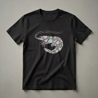 - Shrimp art graphic tee with a delicate floral-filled silhouette for marine enthusiasts.