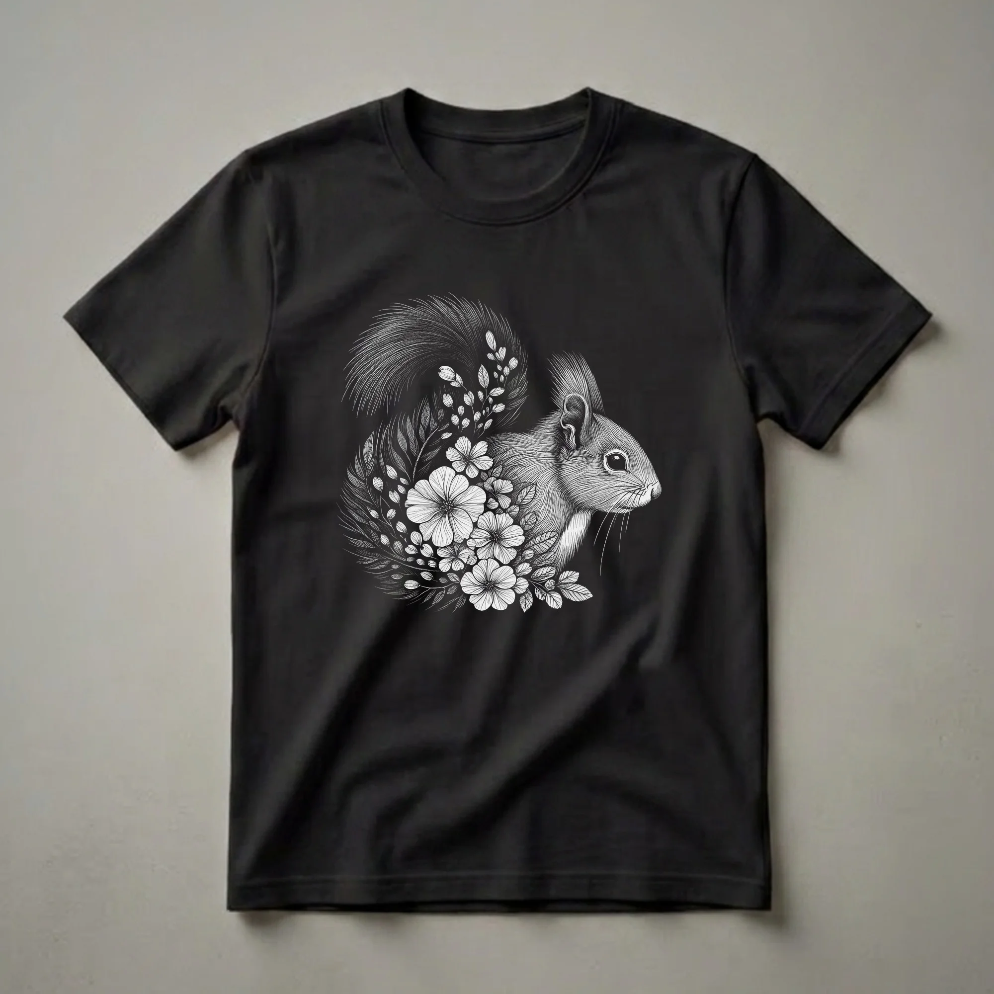 Woodland wildlife enthusiasts will appreciate the intricate detail of this striking graphic tee, which features a beautifully rendered squirrel face and its iconic bushy tail. The artwork is presented in a scratchboard style, with fine lines creating a sense of texture and depth in the squirrel's fur and the surrounding floral elements. Delicate flowers and leaves are artfully arranged around the squirrel, creating a harmonious blend of nature's beauty. Squirrels, known for their agility and presence in forests and parks, are a beloved part of many natural landscapes. This t-shirt captures their charm with an artistic flair, making it a standout piece for anyone who enjoys the outdoors. This shirt works well for hikers, nature photographers, or anyone who finds joy in observing wildlife. It makes a thoughtful gift for a friend or family member who cherishes the natural world and unique artistic designs. Wear this eye-catching tee on your next nature walk or casual outing to express your connection to the wild.