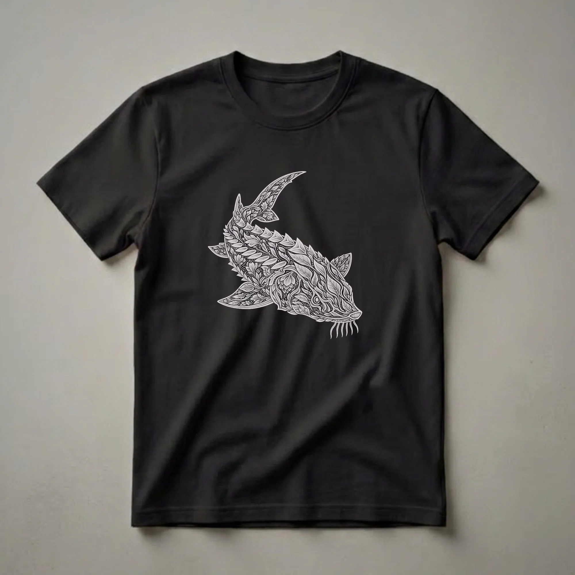 Marine life enthusiasts will appreciate the intricate detail of this sturgeon t-shirt, which showcases a striking artistic interpretation of the ancient fish. The design features a sturgeon rendered entirely in flowing floral and leaf patterns, creating a unique and eye-catching visual. Sturgeon are among the oldest fish families, with species found in both freshwater and saltwater environments across the Northern Hemisphere. They are known for their distinctive elongated bodies, bony plates, and barbels near their mouths, all of which are artfully depicted through delicate linework and botanical motifs in this design. This graphic tee is a fantastic way for anglers, divers, or anyone fascinated by the underwater world to express their passion. It makes a thoughtful gift for someone who cherishes the ocean's biodiversity or enjoys unique, nature-inspired art. Wear this shirt to your next fishing trip, a visit to an aquarium, or simply as a conversation starter that highlights the beauty of these remarkable creatures. This sturgeon shirt is a staple for any nature lover's wardrobe.
