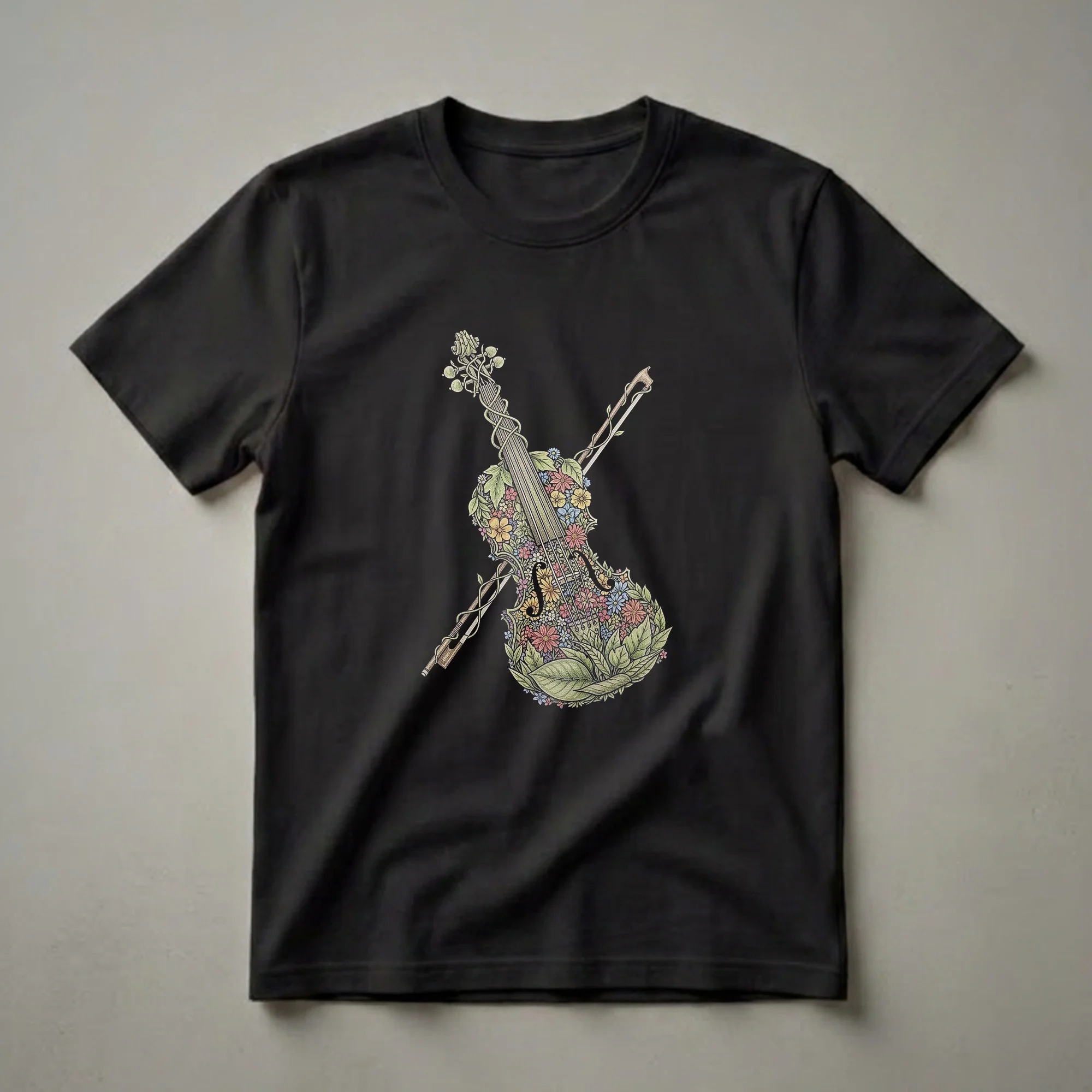 - This tee showcases a vibrant watercolor violin crafted entirely from colorful flowers and lush greenery.