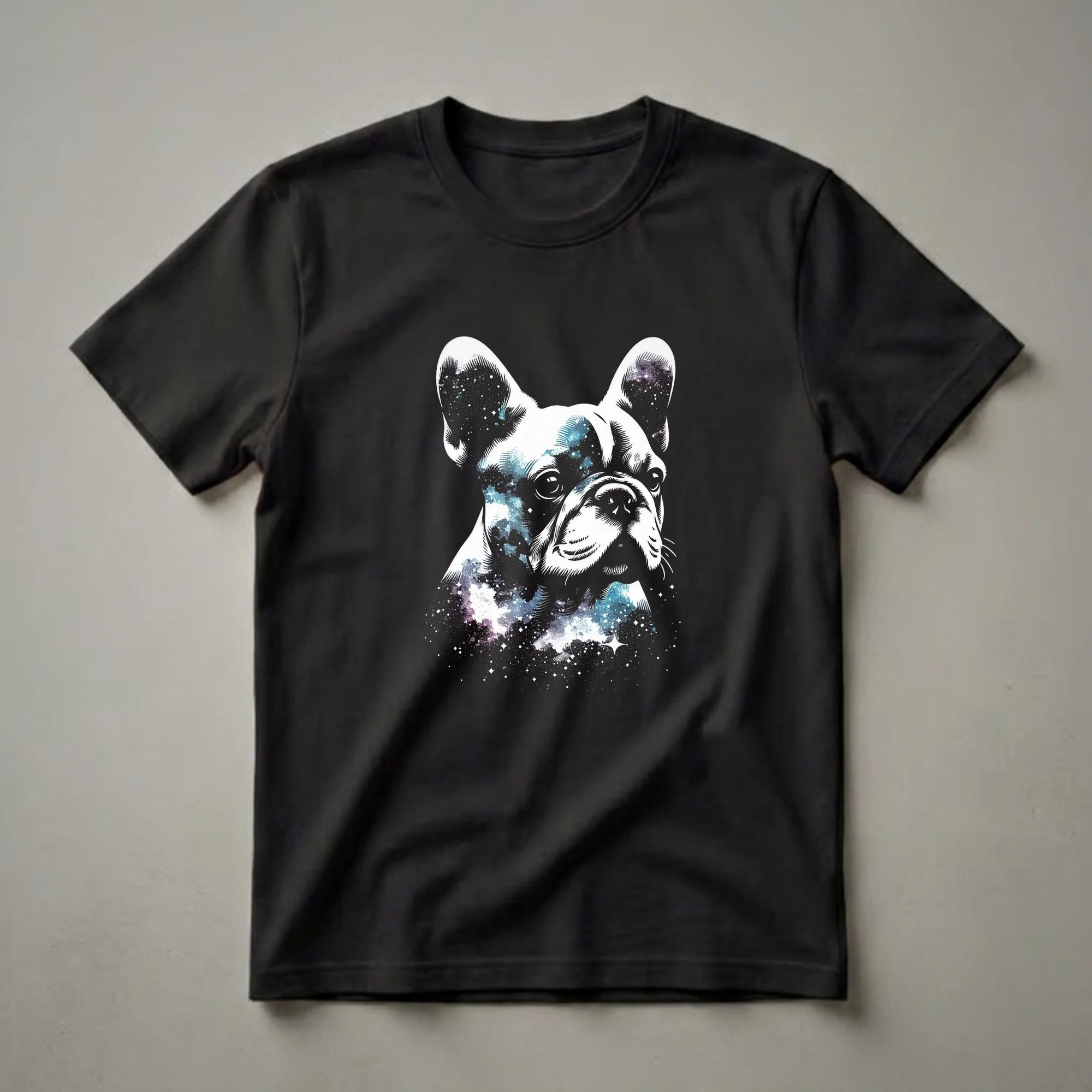 - Features a striking French Bulldog face filled with a galaxy nebula.
