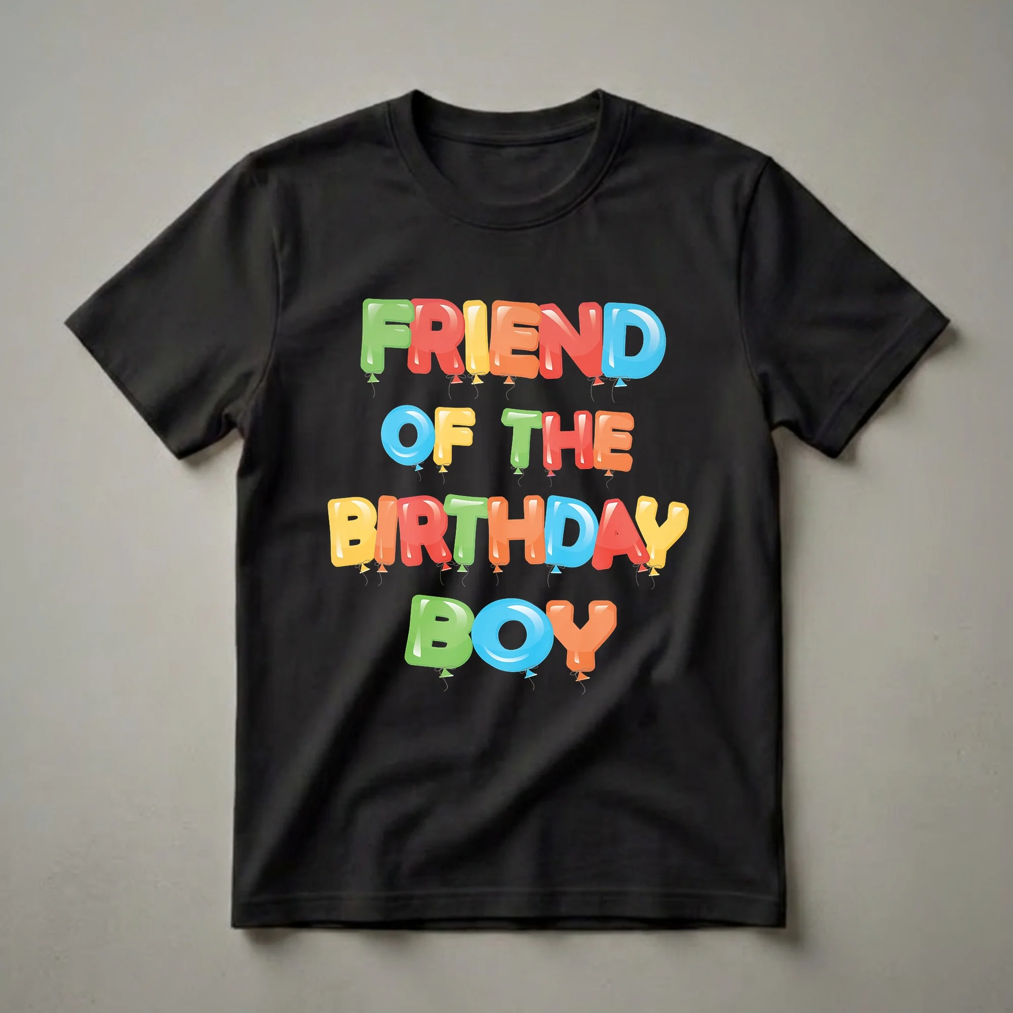 Friends of the birthday boy can show their support with this vibrant graphic t-shirt. The design features bold, colorful letters that mimic inflated balloons, spelling out "FRIEND OF THE BIRTHDAY BOY." Each letter is rendered with a glossy finish and subtle highlights, giving it a playful, festive appearance. The letters are arranged in four lines, creating a dynamic visual that stands out against the black background. This tee is a fantastic way for any friend to join in the birthday celebration, whether at a party, a family gathering, or a casual get-together. It's a thoughtful gift for the best friend, the cousin, or any young attendee who wants to be part of the birthday boy's special day. Wearing this shirt makes it clear who they are celebrating and adds an extra layer of fun to the festivities. It's a staple for any birthday party outfit, ensuring everyone knows they are a key part of the birthday boy's crew. This shirt works well for boys and young men attending a birthday party.