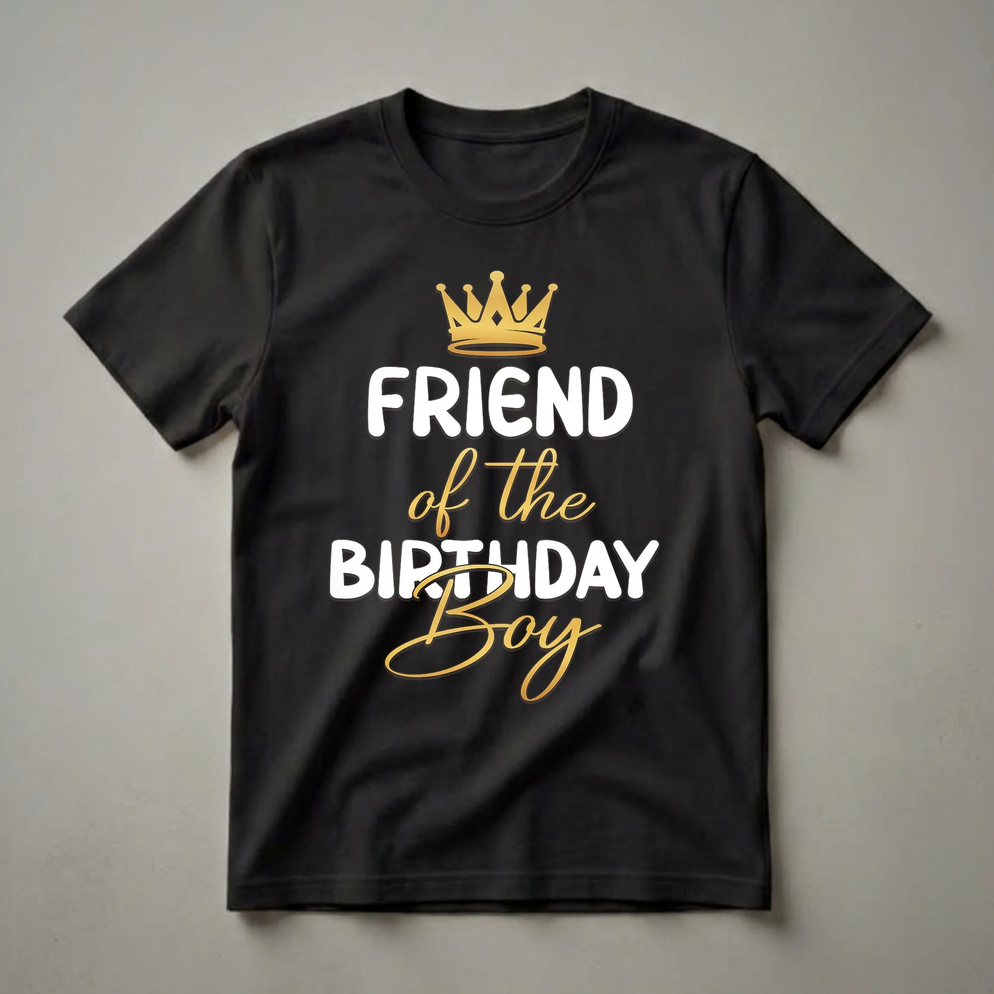 The birthday boy's best friend can proudly wear this graphic tee, featuring a bold statement and a regal touch. The design showcases a golden crown positioned above the text 'FRIEND of the BIRTHDAY Boy'. The words 'FRIEND' and 'BIRTHDAY Boy' are rendered in a clean, white, sans-serif font with a subtle dark outline, while 'of the' appears in an elegant, flowing golden script. This shirt is a fantastic way for any boy's friend to show their support and join in the birthday festivities. It’s a thoughtful gift idea for a son, nephew, or young friend who is celebrating a milestone birthday. Imagine him wearing this t-shirt to his birthday party, school, or any casual gathering where he wants to highlight his special role. This eye-catching apparel makes a statement and adds a fun element to any birthday celebration, ensuring he feels recognized and celebrated among his peers. It’s a staple for any friend wanting to stand out during the birthday boy's big day.