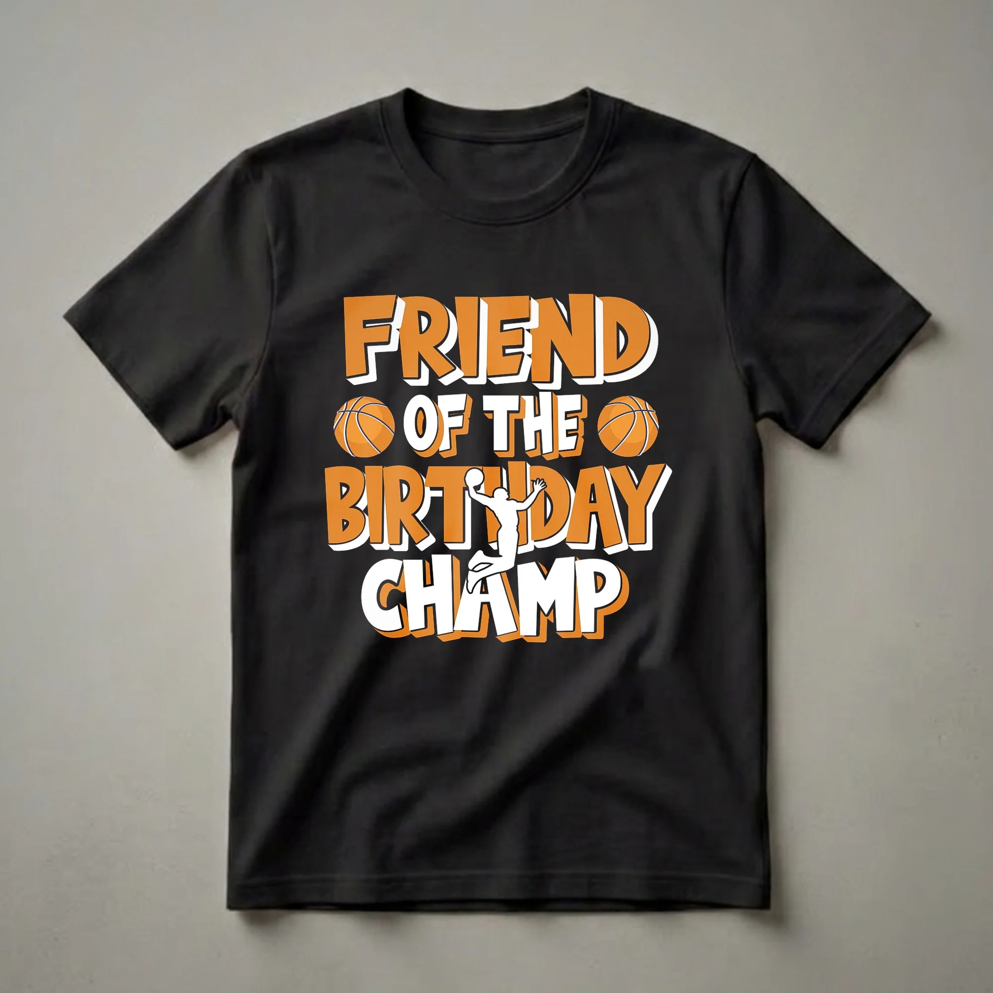 Boys who love basketball will reach for this eye-catching tee to celebrate their friend's birthday. The graphic features bold, stylized text that reads "FRIEND OF THE BIRTHDAY CHAMP" in vibrant orange and white. Flanking the text are two classic basketballs, and centrally, a dynamic silhouette of a basketball player is captured mid-air, ready to dunk. This shirt is a fantastic way for a young player to show support for the birthday boy on his special day. Basketball is a sport that requires teamwork and camaraderie, making this shirt a fitting tribute to the bond between friends. Whether worn to a birthday party, a casual get-together, or just for everyday wear, this t-shirt celebrates the joy of the game and the excitement of a birthday celebration. It makes a thoughtful gift for any boy who is a fan of basketball and wants to cheer on his friend. This apparel is a slam dunk for any young athlete.