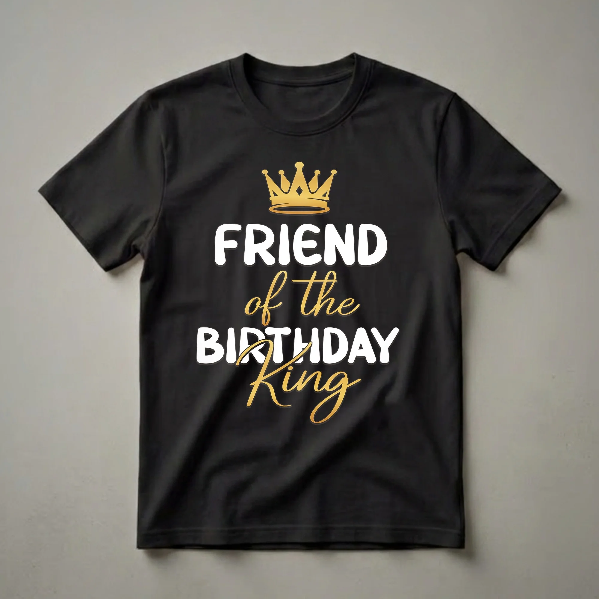 - Features a regal golden crown above bold 'FRIEND of the BIRTHDAY King' lettering.