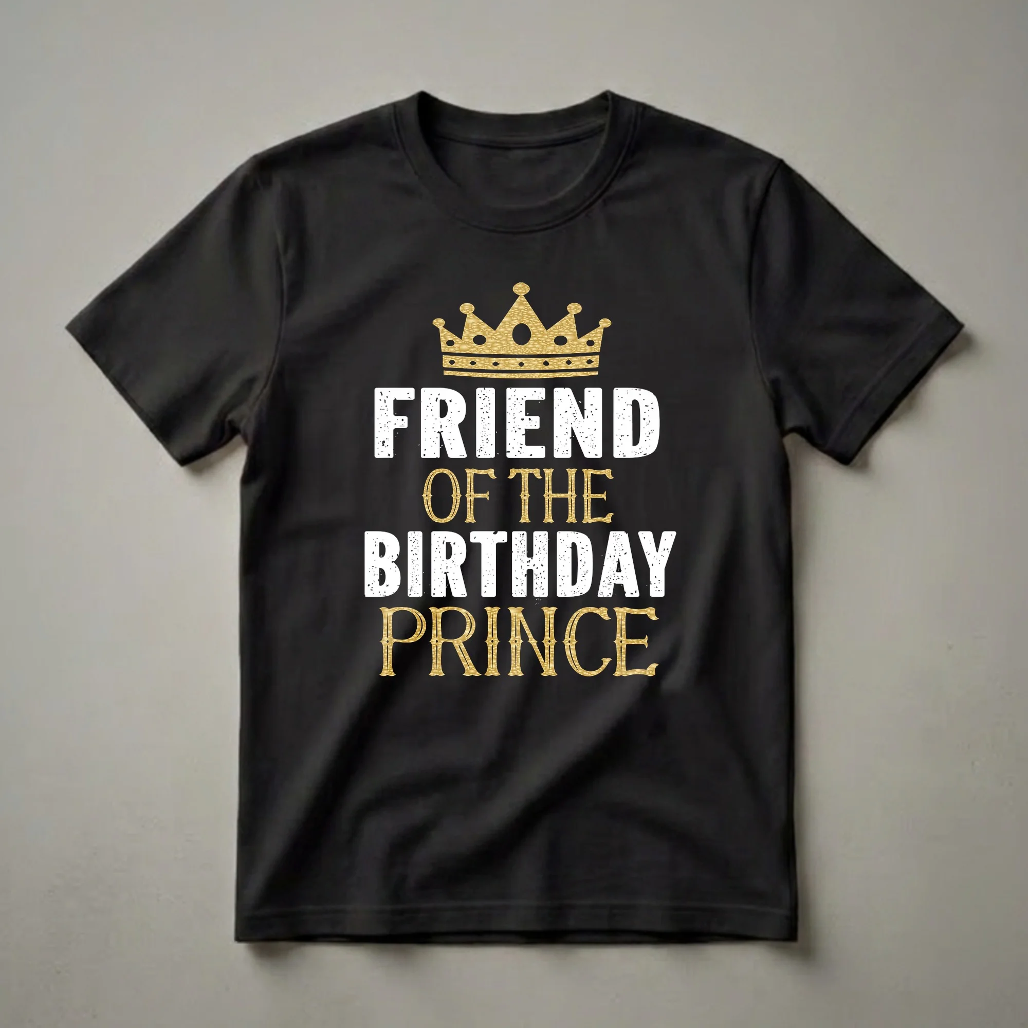 - Features a regal gold crown above bold white lettering that reads 'FRIEND OF THE BIRTHDAY PRINCE'.