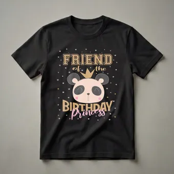 Friends of the birthday princess will love this charming graphic tee, featuring a cute cartoon panda sporting a golden crown. The panda's face is rendered in soft pink and grey, with playful black accents around its eyes and a sweet smile. Scattered stars in gold, silver, and pink add a festive touch against the black background, enhancing the celebratory mood. The text "FRIEND of the" is presented in a collegiate-style font in gold, while "BIRTHDAY Princess" is split, with "BIRTHDAY" in a similar gold font and "Princess" in a flowing pink script. This t-shirt is a thoughtful gift for any young girl who is attending a friend's birthday party, especially if the theme involves pandas or royalty. It's a fun way for her to show her support and be part of the birthday magic. Imagine her excitement wearing this shirt to the party, feeling like a special part of the royal celebration. This shirt is a delightful addition to any young girl's wardrobe, a thoughtful choice for birthday parties or any occasion where a touch of fun and friendship is desired. It's a great way for friends to bond and celebrate together.