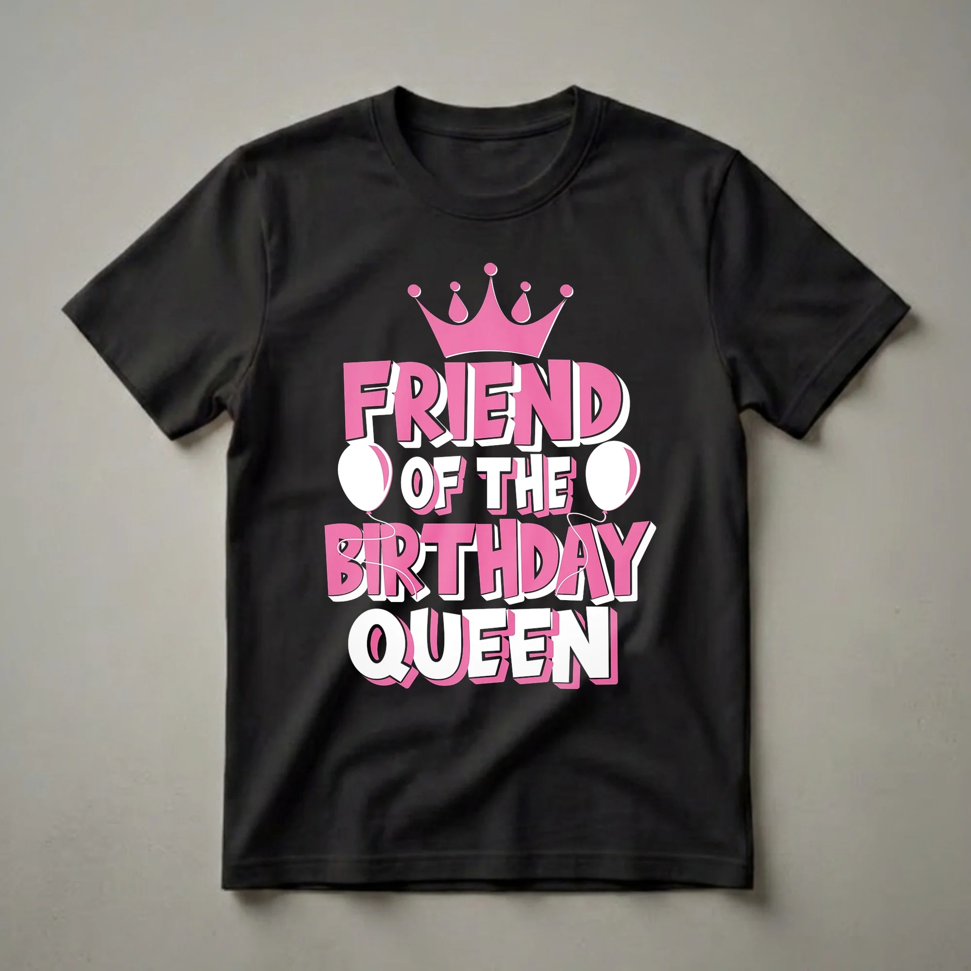 Friends and family members who want to celebrate the special birthday queen will reach for this eye-catching graphic tee. The design features bold, pink lettering with a white outline, spelling out "FRIEND OF THE BIRTHDAY QUEEN." Above the text sits a vibrant pink crown, symbolizing royalty and celebration. Flanking the central text are two white balloons with pink accents, adding a festive touch to the overall design. This t-shirt is a fantastic way for anyone in the birthday girl's inner circle to show their love and support. It's a staple in any birthday celebration collection, great to wear to parties, family gatherings, or birthday brunches. This shirt makes a thoughtful gift for any friend or family member who wants to join in on the birthday festivities and honor the guest of honor. Imagine the birthday queen's delight seeing her friends and family all sporting matching or coordinating apparel, creating a memorable and cohesive look for the celebration. This shirt is more than just apparel; it's a statement of friendship and family support during a milestone occasion.