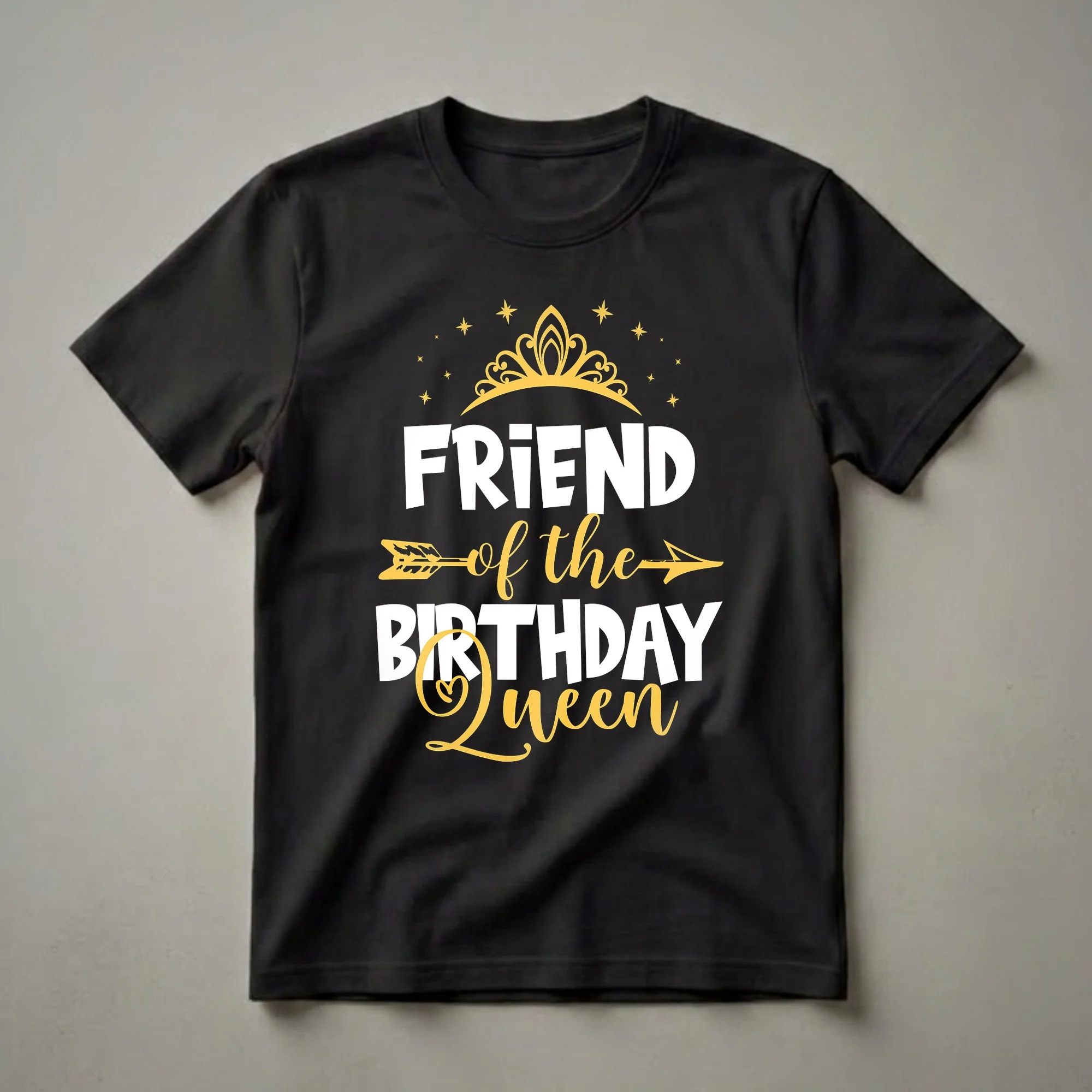 Friends of the birthday queen will reach for this eye-catching graphic tee to show their support and celebrate the special day. The design features bold white lettering that reads "FRIEND" above a playful yellow script that says "of the". An arrow, also in yellow, pierces through the center of the script, adding a touch of whimsy. At the top, a golden crown adorned with stars sits regally, signifying the queen of the day. This t-shirt is a fantastic way for anyone to acknowledge their role as a close companion to the birthday girl. It makes a thoughtful gift for a best friend, sister, or any woman celebrating a milestone birthday. Imagine her wearing this shirt to her birthday brunch or party, surrounded by loved ones. It’s a comfortable and stylish way to join in the festive spirit and honor the birthday queen. This shirt is a staple for anyone who loves to celebrate their friends and their special occasions.