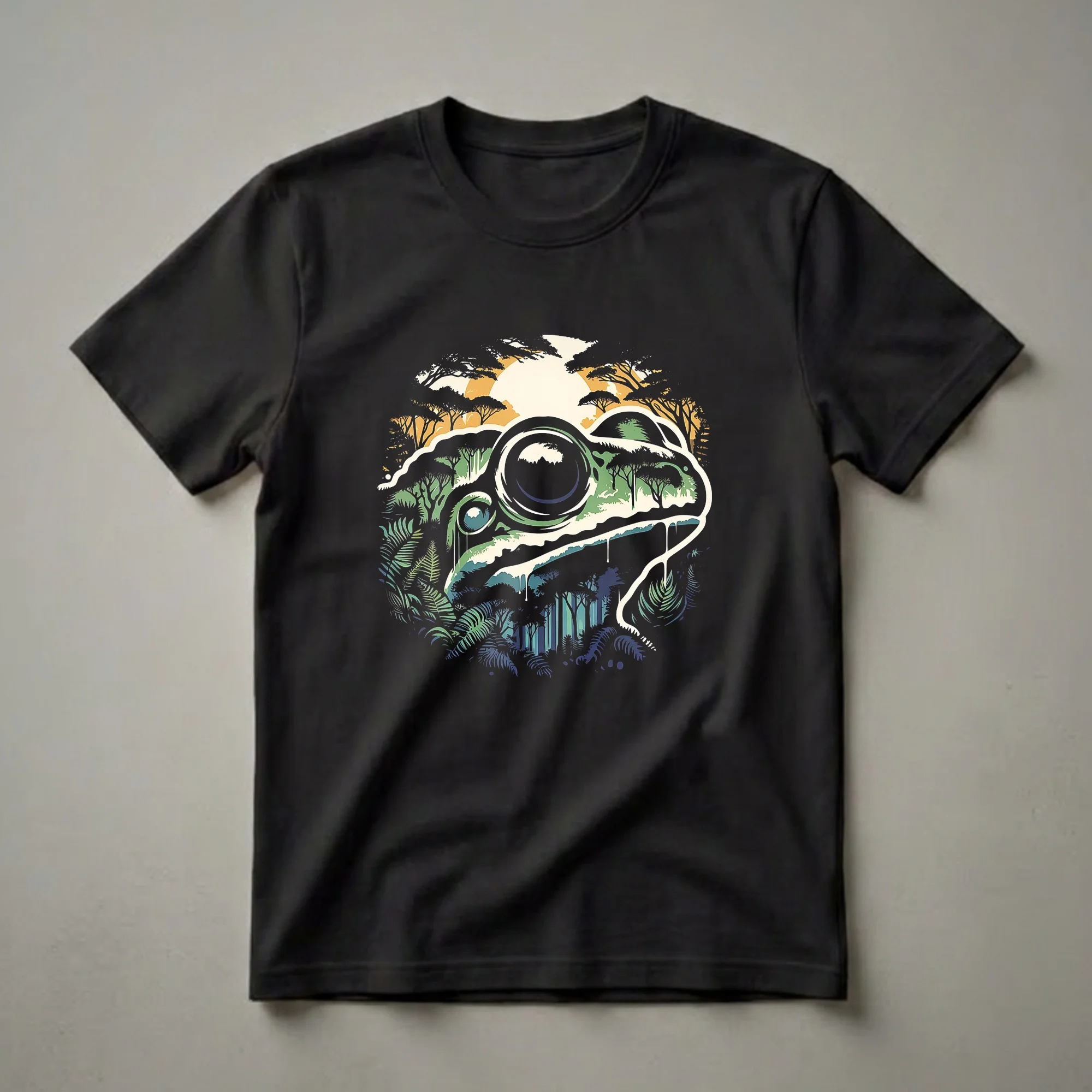 Reptile enthusiasts and nature lovers will appreciate this striking graphic tee that merges the iconic form of a frog with a vibrant rainforest ecosystem. The design features a close-up of a frog's head, its large eye gazing outward, while within its silhouette, a lush rainforest scene unfolds. Silhouetted trees, dense foliage, and ferns create a layered effect, evoking the rich biodiversity of a tropical environment. A warm, setting sun or moon peeks through the canopy, casting an orange glow that contrasts with the deep greens and blues of the forest. This artistic t-shirt is a wearable piece of art, a thoughtful choice for anyone fascinated by amphibians and their natural habitats. Frogs are vital indicators of environmental health, thriving in moist environments like rainforests, where they play a crucial role in insect population control. This shirt makes a thoughtful gift for the herpetologist in your life or for someone who simply admires the intricate beauty of the natural world. Wear this tee to your next nature walk or casual outing to spark conversations about conservation and the wonders of the wild.
