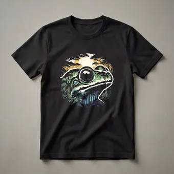 - This striking frog t-shirt displays a detailed rainforest scene within its graphic.
