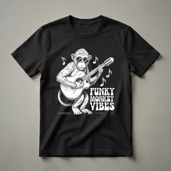 Chimpanzees, known for their intelligence and dexterity, are often observed using tools and exhibiting complex social behaviors. This striking graphic tee captures a chimpanzee in a moment of musical expression, strumming an acoustic guitar with a pair of cool sunglasses perched on its nose. Musical notes float around the primate, adding to the 'Funky Monkey Vibes' depicted in the bold, retro-style lettering. The detailed linework of the illustration brings the scene to life, showcasing the texture of the monkey's fur and the details of the guitar. This shirt is a fantastic choice for guitarists who appreciate a touch of humor and a retro aesthetic in their wardrobe. It's also a thoughtful gift for music students or anyone who enjoys the soulful sound of an acoustic guitar. Wear this tee to your next jam session, a casual music festival, or just when you want to showcase your love for music with a playful twist. The design is a conversation starter, a thoughtful choice for musicians and music enthusiasts alike.
