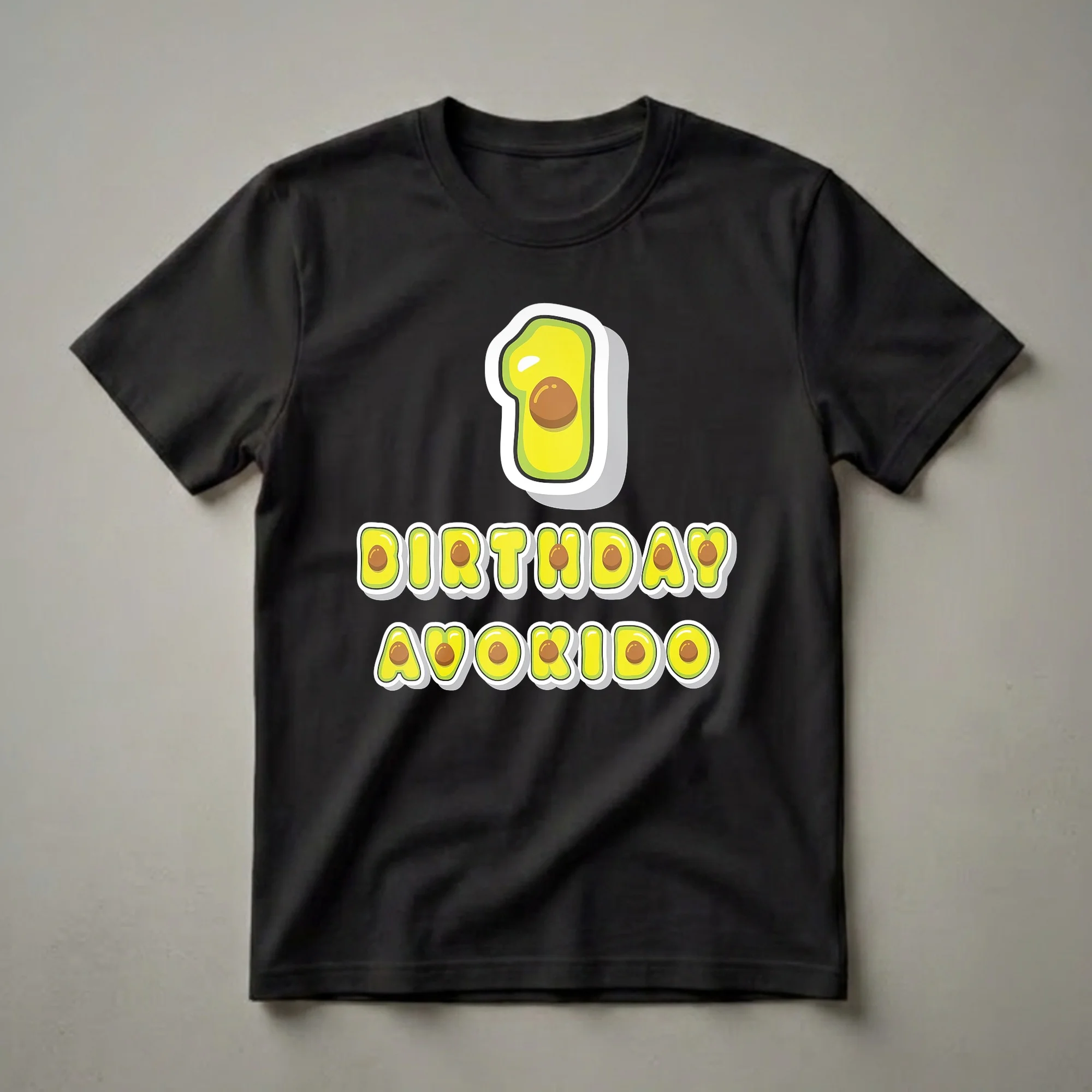 This playful graphic tee makes a delightful addition to any 1st birthday celebration. The design prominently features a large number '1' rendered in the shape of a cartoon avocado, complete with its pit. Below the number, the words 'BIRTHDAY AVOKIDO' are written in a bubbly, fun font, with each letter also styled to resemble halves of avocados, showcasing their bright green flesh and brown pits. This unique text and imagery combine for a memorable look. Avocados are a nutritious fruit, often enjoyed by babies as they begin to explore solid foods due to their creamy texture. Introducing this fun 'Avokido' theme to a first birthday party adds a touch of humor and personality. This shirt is intended for any one-year-old celebrating their inaugural birthday. It serves as a thoughtful gift from parents, grandparents, aunts, or uncles looking for a unique way to commemorate the milestone. Imagine the adorable photos captured as the birthday child wears this special t-shirt during their party, surrounded by family and friends. This apparel is a thoughtful gift for the birthday bash, cake smash photo session, or casual wear during the festive occasion.