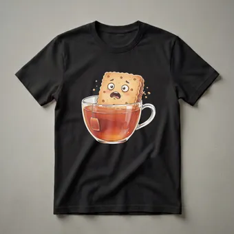 Tea lovers and biscuit aficionados will appreciate this eye-catching graphic tee. The design showcases a cartoon biscuit with wide, startled eyes and an open mouth, looking as if it's having a moment of panic as it sinks into a clear glass mug filled with amber-colored tea. A tea bag tag dangles from the rim, adding to the whimsical scene. Splashes of tea erupt around the biscuit, emphasizing its dramatic plunge. This shirt is a playful nod to the simple joy of dunking a biscuit into a hot beverage, a ritual enjoyed by many. Biscuits, often made from flour, sugar, and butter, have been a popular snack for centuries, evolving from simple hardtack to the diverse array of sweet and savory treats available today. The act of dunking, while common, can sometimes lead to a biscuit's unfortunate demise if not timed perfectly. This t-shirt captures that relatable, humorous moment. It makes a thoughtful gift for friends who enjoy a good cup of tea and a chuckle, or for anyone who works in the food or beverage industry and appreciates a bit of fun in their apparel. Wear this tee to your next tea break, a casual brunch, or while relaxing at home with your favorite snack.