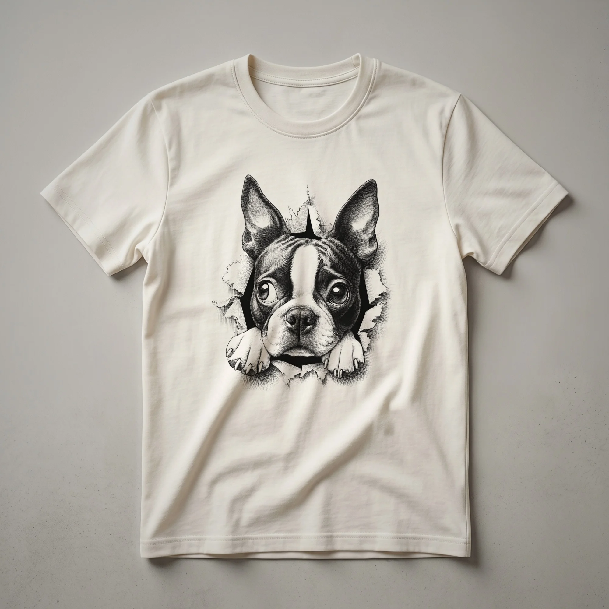 - Sport this Boston Terrier peeking design at casual outings or dog-themed events.