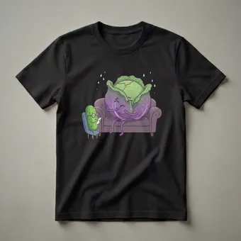 This eye-catching graphic tee showcases a whimsical scene of a red cabbage sitting on a plush couch, tears streaming down its leafy face. Beside it, a green pickle, sporting glasses and holding a notepad, appears to be acting as a therapist. Droplets of water, representing tears, fall from above, emphasizing the emotional nature of the scene. This design playfully explores themes of mental wellness and art therapy through anthropomorphic vegetables. Cabbage, a cruciferous vegetable, is known for its dense layers and nutritional value, often used in salads and cooked dishes. Pickles, made from cucumbers, are a popular fermented food enjoyed worldwide. This shirt is a thoughtful gift for anyone who loves vegetables, enjoys quirky humor, or appreciates designs that spark conversation. It's a unique way to express a love for healthy eating with a humorous twist. Wear this tee to your next gym session or a casual outing to bring a smile to others' faces. It’s a staple in the collection for those who appreciate a good laugh and a clever design.