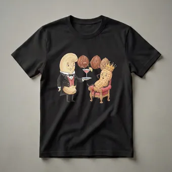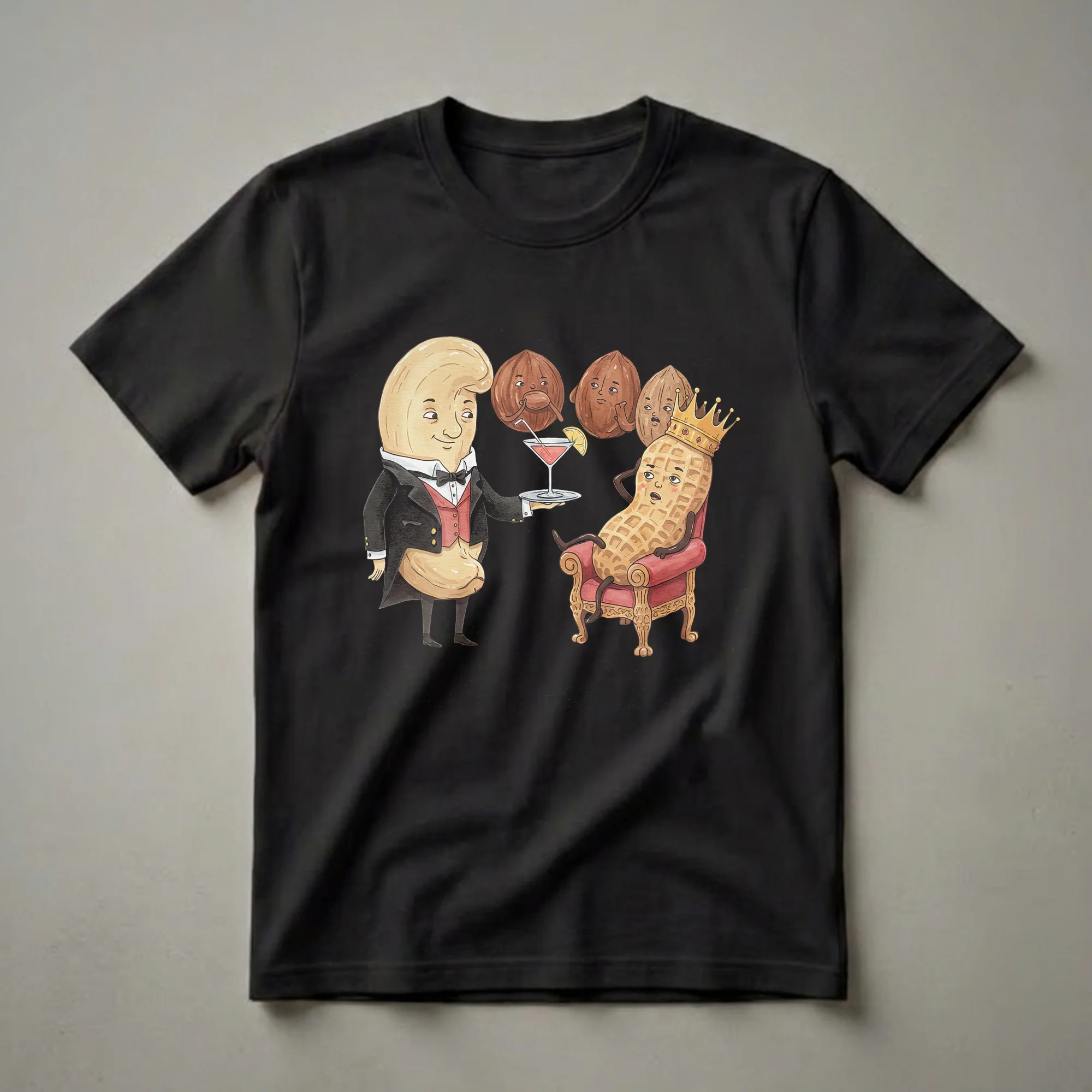 Cashew lovers and peanut enthusiasts will appreciate this whimsical graphic tee. The artwork depicts a cashew dressed as a butler, meticulously serving a pink cocktail to a peanut adorned with a golden crown, who lounges regally on a plush red armchair. Behind the peanut king, three other nuts, likely walnuts or pecans, observe the scene with expressions ranging from curiosity to mild concern. This playful scene humorously elevates common nuts to royal status, a concept that resonates with the playful side of food culture. The watercolor style lends a charming, artistic touch to the design, making it stand out. This shirt works well for anyone who enjoys a good pun or has a particular fondness for nuts, whether they are a chef, a bartender, or simply a foodie who loves to share a laugh. It makes a thoughtful gift for friends or family members who have a quirky sense of humor and an appreciation for unique apparel. Wear this eye-catching tee to casual gatherings, game nights, or simply when you want to add a touch of fun to your everyday wardrobe. It’s a conversation starter that celebrates the lighter side of culinary appreciation.