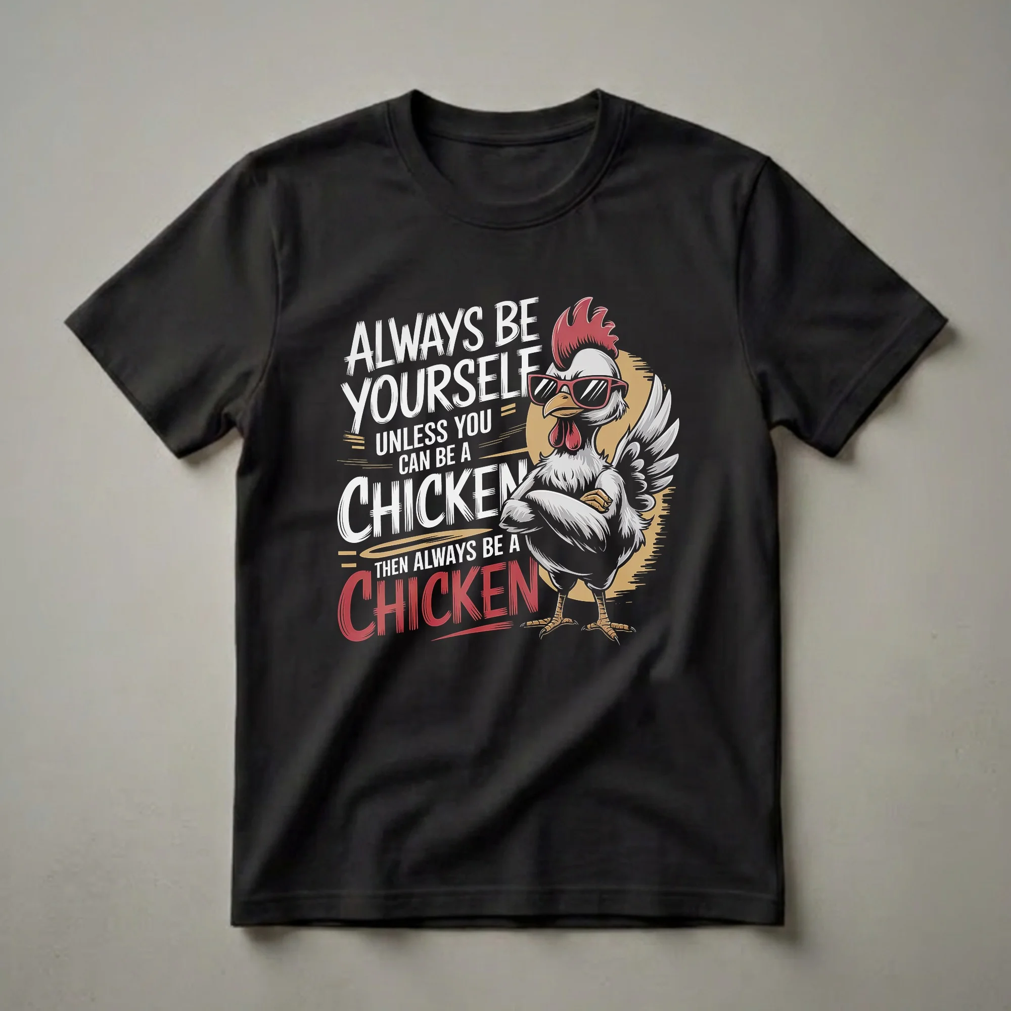 Farm animal enthusiasts and lovers of quirky humor will appreciate this eye-catching graphic tee. The design features a cool, anthropomorphic chicken sporting stylish red sunglasses and a confident stance with its arms crossed. Bold white and red lettering proclaims, "Always Be Yourself Unless You Can Be A Chicken, Then Always Be A Chicken." This playful message is a thoughtful choice for those who don't take themselves too seriously and enjoy a bit of lighthearted fun. Chickens, known for their social structures and surprisingly complex behaviors, are a common sight on farms worldwide, symbolizing a connection to the land and a simpler way of life. This shirt makes a thoughtful gift for friends, family members, or anyone who enjoys a good chuckle and has a fondness for poultry. It's a go-to tee for casual outings, game nights, or just lounging around the house, offering a unique way to express personality and a sense of humor. Wear this t-shirt to show off your unique sense of style and your appreciation for the unexpected wisdom found in a feathered friend.