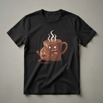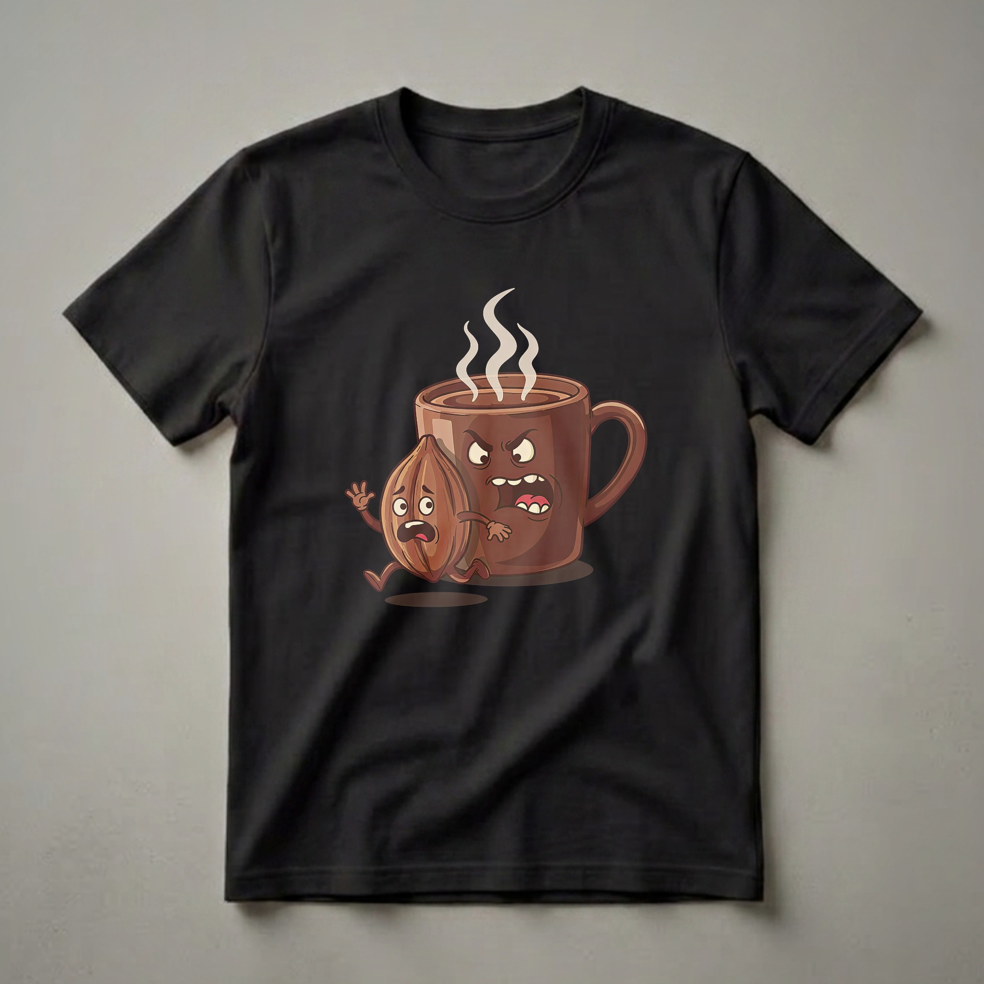 Coffee lovers and chocolate aficionados will appreciate this eye-catching graphic tee. The design showcases a cartoon cocoa bean in a frantic dash, with a steaming mug of coffee in hot pursuit. The coffee mug has an exaggerated angry expression, complete with furrowed brows and a wide-open mouth, while the cocoa bean looks terrified with wide eyes and outstretched arms. This playful scene captures the often intense relationship between these two beloved treats. Cacao beans, the source of all chocolate, are roasted and ground to create cocoa powder, a key ingredient in many coffee-based drinks and desserts. This shirt makes a thoughtful gift for baristas, bakers, or anyone who enjoys a morning cup of coffee or a rich chocolate treat. It's a staple in the collection for those who love a good laugh and a delicious beverage. Wear this tee to your favorite coffee shop or while enjoying a cozy night in.