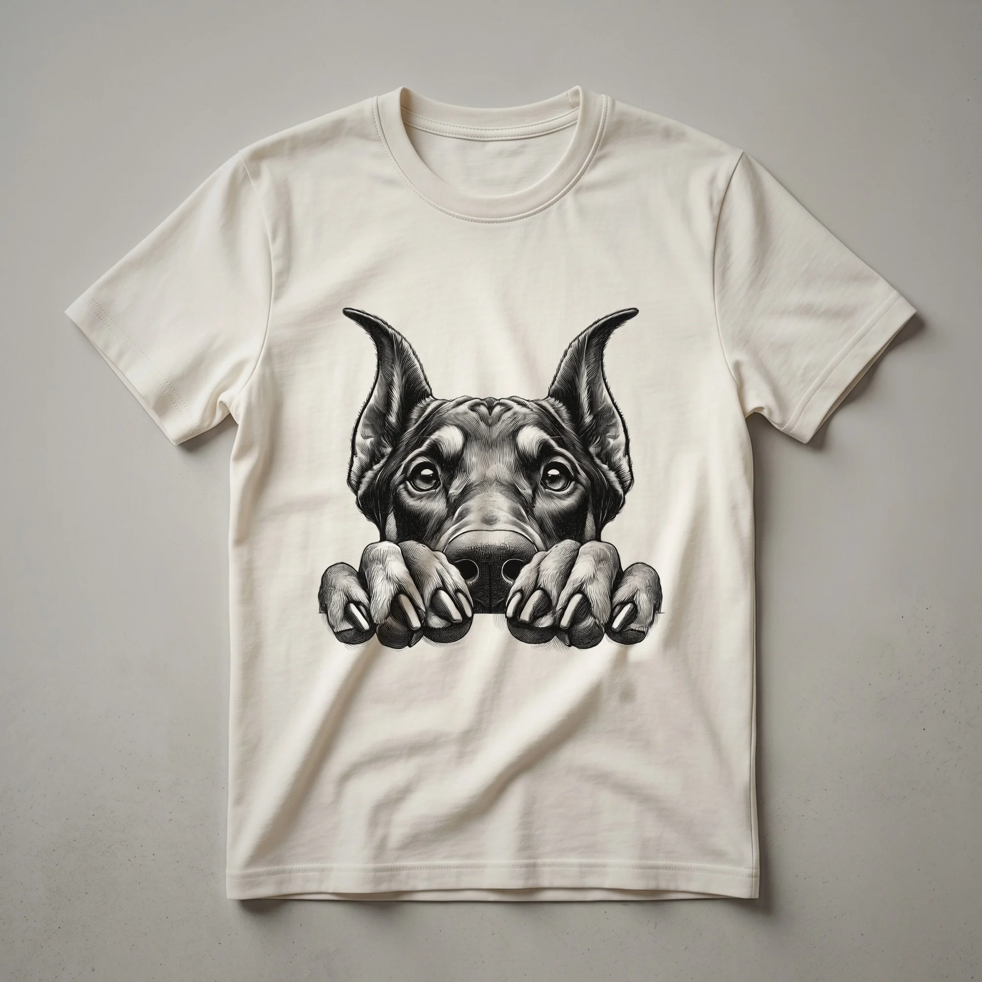 Doberman Pinscher owners know the breed's intelligence and loyalty, often displayed with a playful curiosity. This graphic tee captures that spirit with a charming illustration of a Doberman's head peeking from the side. The design features a friendly, cartoonish rendition of the distinctive Doberman Pinscher face, complete with its alert ears and expressive eyes. This t-shirt is a fantastic way for any Dobie mom or dad to showcase their affection for their canine companion. Dobermans, originally bred in Germany in the late 19th century, are known for their sleek build and protective nature, but this shirt highlights their more lighthearted side. It's a staple in the collection for anyone who cherishes their Doberman. This shirt works well for casual outings, dog park visits, or simply relaxing at home with your furry friend. Looking for a thoughtful gift for the Doberman lover in your life? This eye-catching tee is sure to bring a smile to their face, making it a go-to choice for birthdays, holidays, or just because.