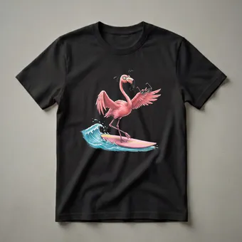 Flamingos, known for their vibrant pink plumage and unique filter-feeding beaks, are now hitting the waves in this eye-catching graphic tee. This shirt showcases a whimsical illustration of a flamingo confidently surfing a cresting blue wave on a pink surfboard. With wide, surprised eyes and sunglasses perched on its beak, this bird embodies the spirit of a seasoned surfer ready for adventure. The dynamic pose, with wings spread for balance and water splashing around, captures the fun and excitement of catching a wave. This t-shirt is a thoughtful gift for surfers, beach enthusiasts, or anyone who appreciates quirky animal humor. It's a go-to tee for casual outings, beach days, or simply adding a splash of personality to your everyday wardrobe. Wear it to your next surf session or a casual get-together and let this surfing flamingo bring a smile to everyone's face. This apparel is a staple for anyone who loves the ocean and a good laugh.