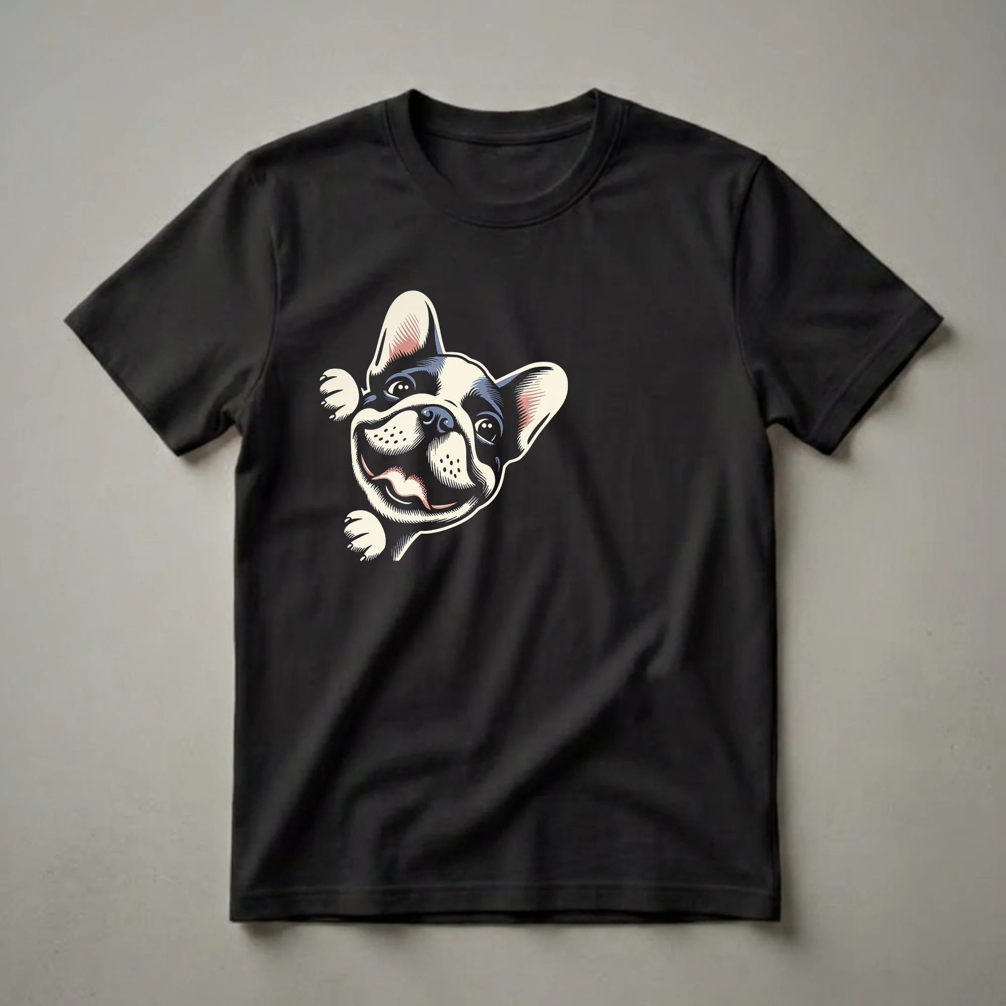 - Features a funny, vintage-style illustration of a peeking Frenchie.