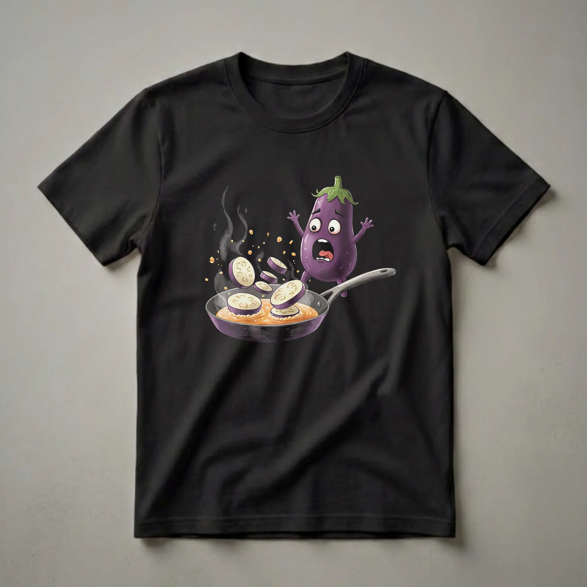 Eggplant owners who appreciate a good food pun will reach for this eye-catching graphic tee. The design showcases a distressed, anthropomorphic eggplant character with wide, panicked eyes and an open mouth, waving its arms in distress. It's depicted mid-air, recoiling from a frying pan filled with bubbling orange oil. Slices of eggplant are actively being fried, adding to the humorous chaos. This visual gag plays on the common preparation of eggplant, turning a culinary staple into a moment of vegetable-based terror. The artwork is rendered in a vibrant, cartoonish style with a black background, making the purple eggplant and orange oil pop. This shirt is a thoughtful gift for vegans, vegetarians, or anyone with a quirky sense of humor who enjoys food-related jokes. It's a conversation starter, great to wear to casual gatherings, game nights, or while out for brunch with friends who will appreciate the vegetable-centric humor. The playful design makes this tee a staple in any collection of funny food apparel.