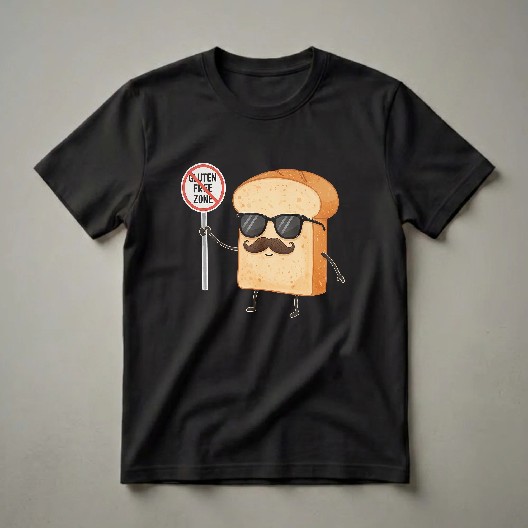 Foodies and bakers who appreciate a good laugh will reach for this humorous bread t-shirt. The design features a cartoon slice of bread, complete with stylish sunglasses and a dapper mustache, confidently holding a sign that reads 'Gluten Free Zone' with a prohibition symbol. This playful graphic humorously declares a space where gluten is not welcome, making it a fun statement piece for anyone in the culinary world. Bread, a staple food across countless cultures for millennia, has seen a rise in specialized diets, including gluten-free options, catering to those with sensitivities or preferences. This tee works well for bakers, chefs, or anyone who enjoys a witty take on food culture. It makes a thoughtful gift for the foodie in your life who loves to express their passion with a smile. Wear this shirt to your next baking class, a casual brunch, or a food festival to spark conversations and share a chuckle.