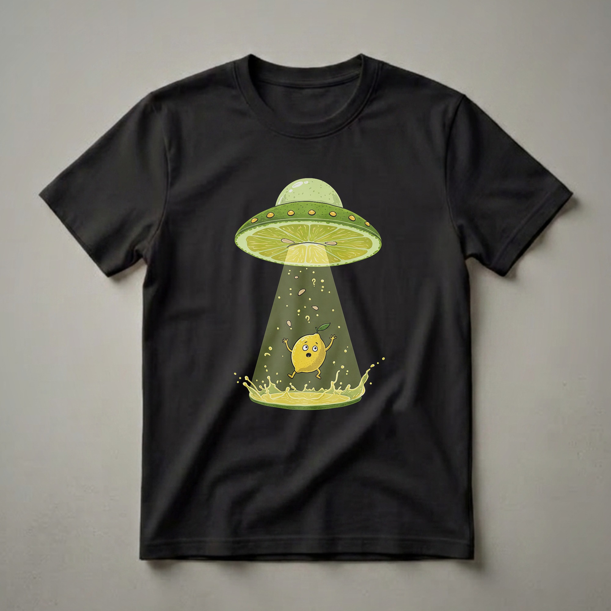 - Humorous t-shirt for citrus lovers featuring a lime slice UFO abducting a bewildered lemon.
