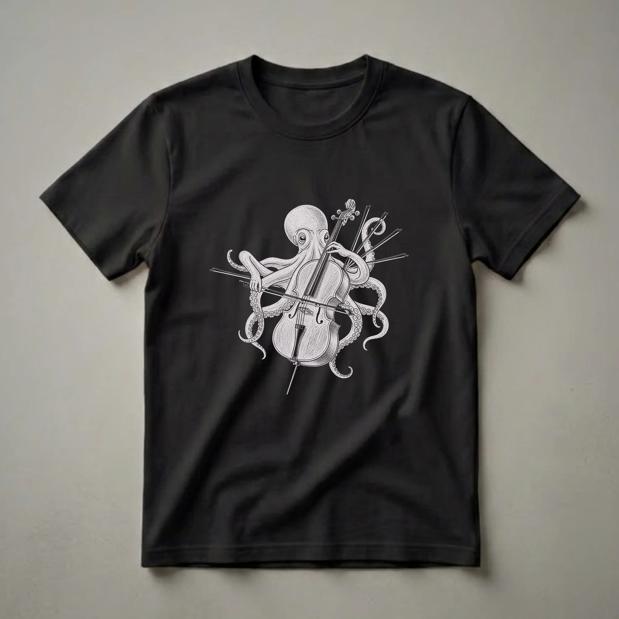 Cellists who appreciate a touch of whimsy will reach for this eye-catching graphic tee. The design features a detailed line drawing of an octopus, expertly playing a cello. With its eight arms, the octopus is depicted holding multiple bows, creating a striking and humorous visual that celebrates the complexity and dedication involved in mastering the cello. This unique t-shirt is a conversation starter, a thoughtful choice for musicians who enjoy a good laugh and want to express their passion for their instrument. Octopuses, known for their intelligence and dexterity, are a fitting symbol for the skill required to play the cello. This shirt works well for music students, orchestra members, or anyone who finds joy in the rich tones of the cello. It makes a thoughtful gift for the cellist in your life, whether for a birthday, holiday, or just because. Wear it to rehearsals, concerts, or casual gatherings to showcase your unique sense of humor and musical dedication. This graphic tee is a staple for any cellist's wardrobe, offering a fun way to connect with fellow music enthusiasts.