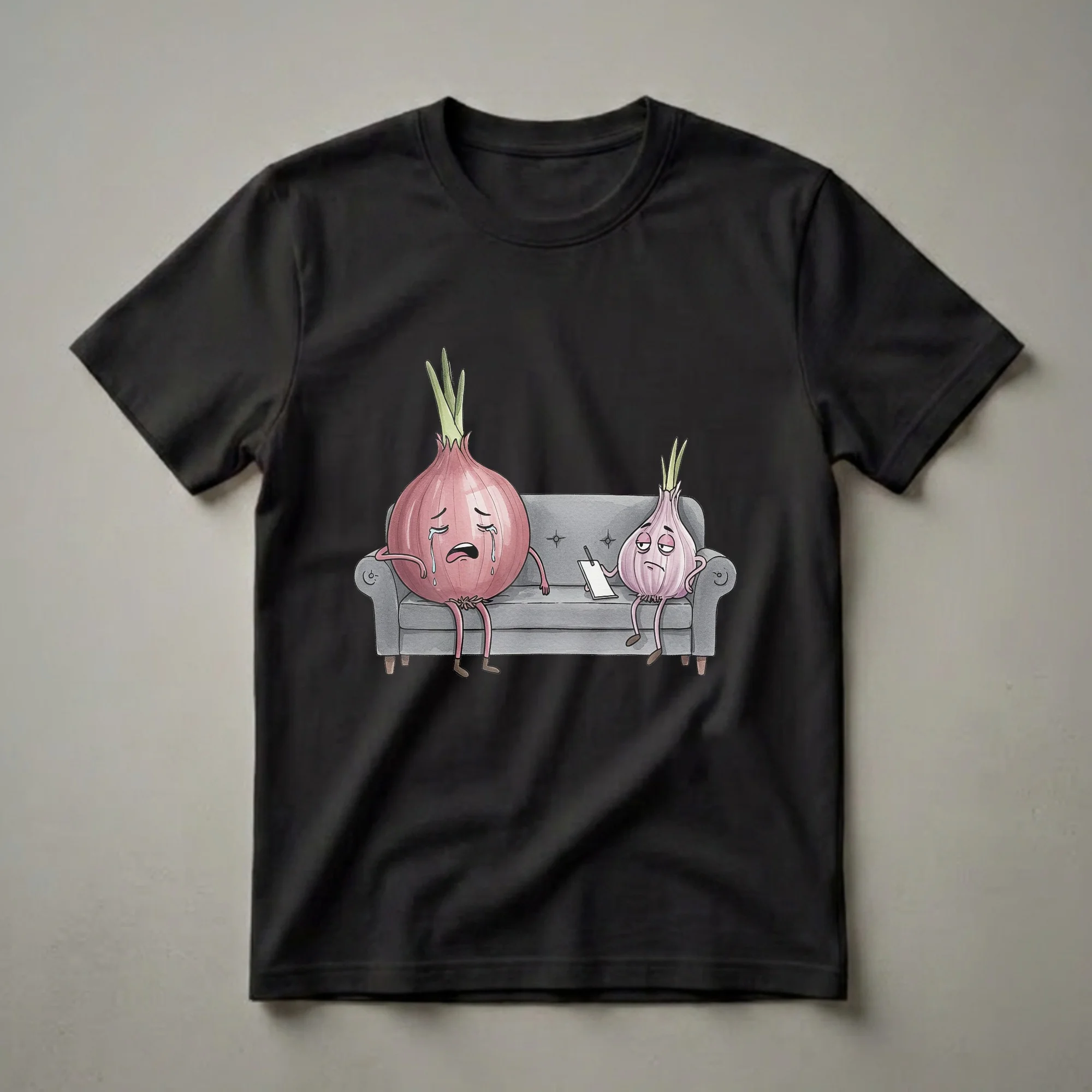 Onion lovers and garlic enthusiasts will appreciate this quirky graphic tee that depicts a hilarious therapy session. The artwork showcases a large, red onion with a tearful expression, sitting on a gray couch and crying dramatically. Beside it, a smaller, purple garlic bulb, looking utterly unimpressed, holds a notepad and pen, seemingly acting as the therapist. This visual gag plays on the common experience of crying when cutting onions, humorously suggesting they might need professional help. This shirt is a playful nod to the culinary world and the emotional impact of certain vegetables. It's a conversation starter for anyone who enjoys puns and food-related humor. This t-shirt works well for casual outings, game nights, or simply lounging at home. It makes a thoughtful gift for chefs, home cooks, or anyone with a good sense of humor who loves to laugh at food-related jokes. Wear this tee to your next brunch or gathering and let the laughter begin.