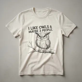 Owl enthusiasts who appreciate a good laugh will reach for this humorous graphic tee. The design features a simple, stylized illustration of an owl, rendered in a minimalist art style. Below the owl, the text reads, "I Like Owls & Maybe 3 People," a witty declaration for those who are selective with their social circles. This shirt is a playful nod to introversion and a celebration of the nocturnal bird's enigmatic nature. Owls, known for their keen eyesight and silent flight, are fascinating creatures found in diverse habitats worldwide, from dense forests to open grasslands. This t-shirt works well for anyone who identifies with the sentiment, particularly those who find solace in the company of their feathered friends or a select few humans. It makes a thoughtful gift for the owl lover in your life who enjoys a bit of dry humor. Wear this tee to casual gatherings, game nights, or simply while enjoying a quiet evening at home. It’s a staple in the collection for anyone who loves owls and a good chuckle.