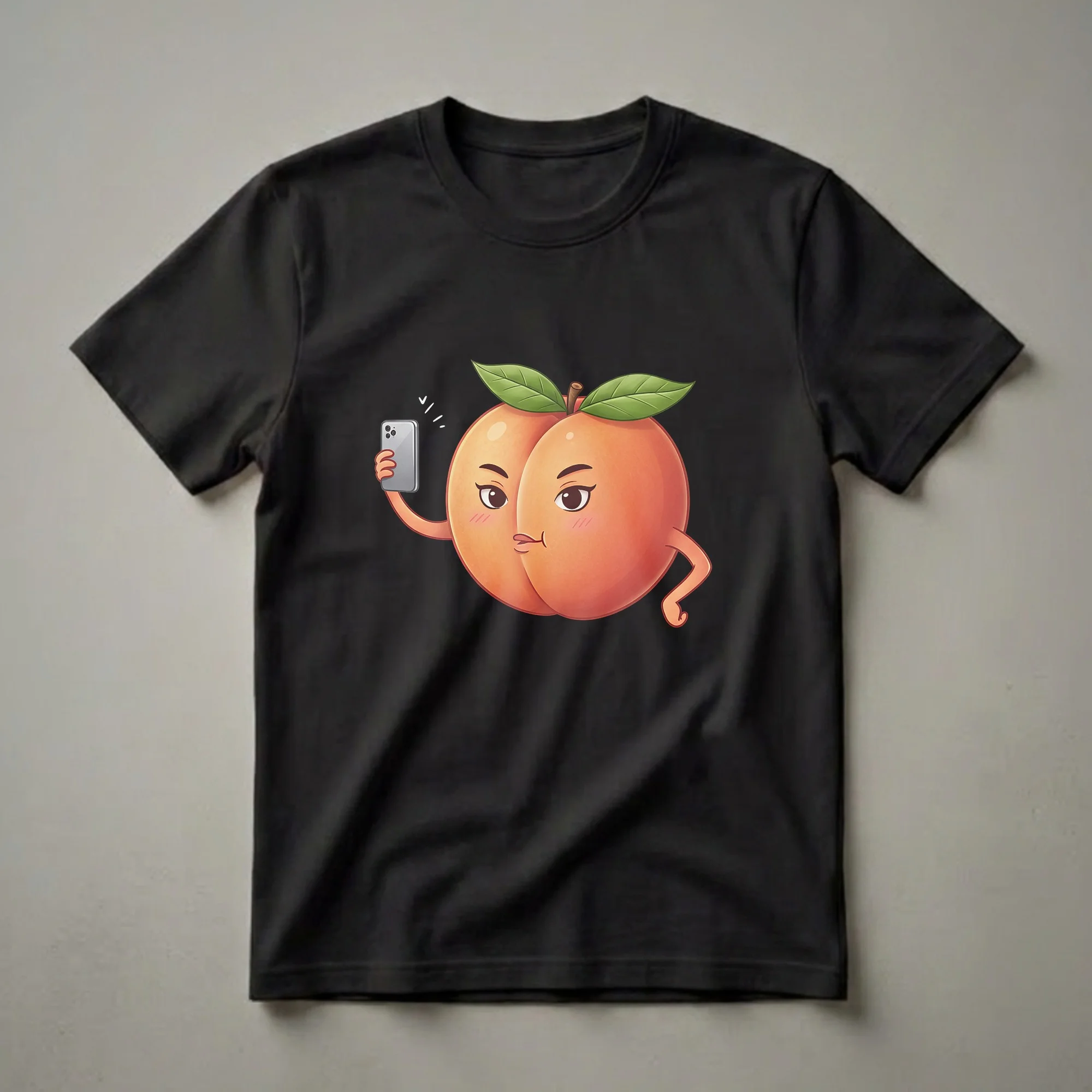 Foodies and fruit lovers will reach for this eye-catching graphic tee featuring a playful peach character. This unique design showcases a ripe peach with a face, striking a pose for a selfie with a modern smartphone. Two green leaves sprout from the top, adding a touch of natural detail to the whimsical illustration. Peaches, known for their fuzzy skin and sweet, juicy flesh, are a beloved summer fruit, often associated with warmth and sunshine. This t-shirt captures that vibrant spirit with a humorous twist. It's a fantastic conversation starter and makes a thoughtful gift for anyone who appreciates a bit of fruit-themed fun. Wear this shirt to your next brunch, casual outing, or even while enjoying your favorite fruit salad. This shirt is a staple in any collection that celebrates culinary humor and quirky art.