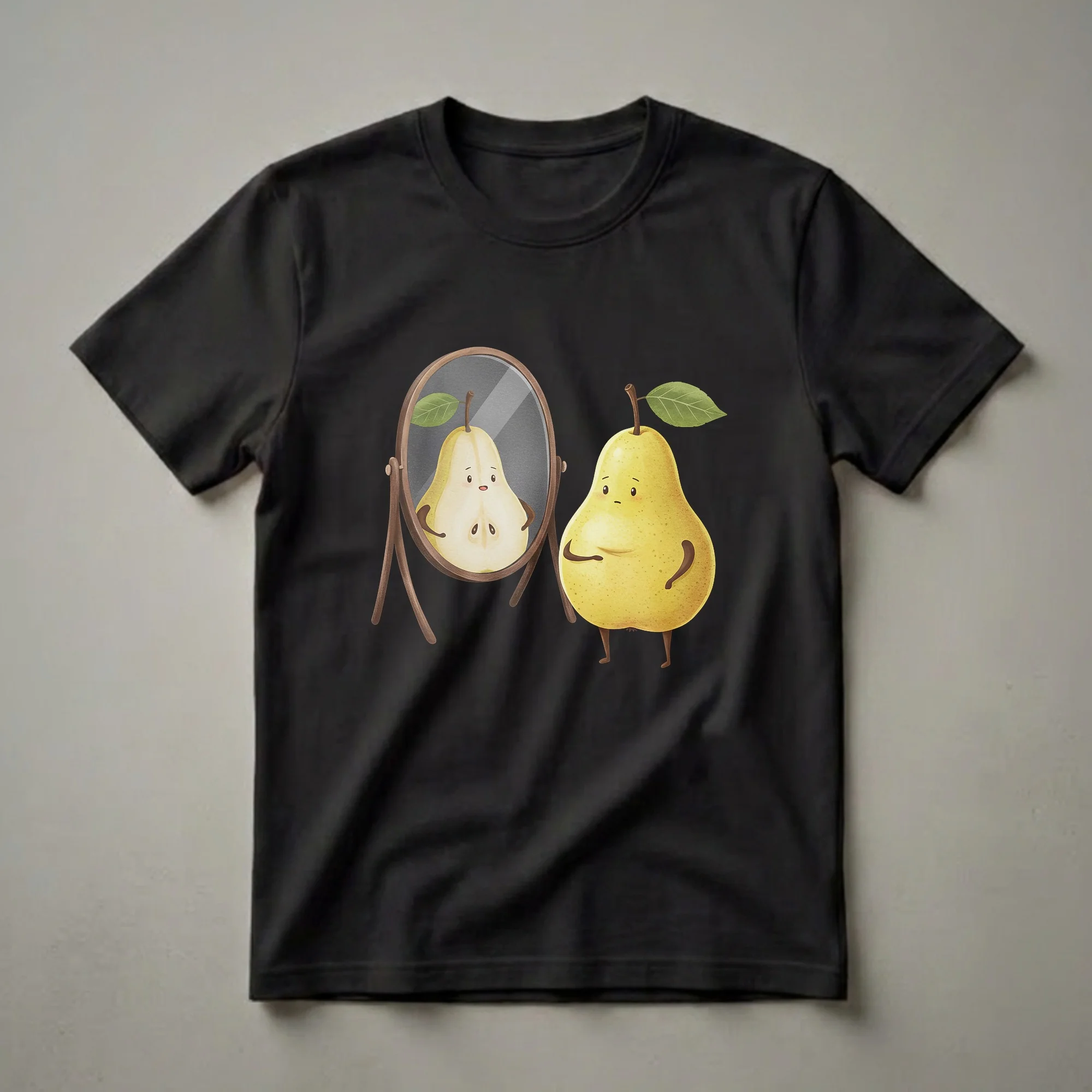Foodies and fruit enthusiasts who appreciate a good chuckle will reach for this eye-catching graphic tee. The design showcases a charming, anthropomorphic pear character standing before a wooden-framed mirror. In the reflection, the pear sees itself sliced in half, revealing its inner seeds and texture, a humorous take on self-perception. Pears, belonging to the rose family, are cultivated worldwide and are known for their sweet, juicy flesh and distinct shape. This t-shirt captures a lighthearted moment, a thoughtful choice for anyone who enjoys playful food-themed art. It makes a thoughtful gift for chefs, bakers, or anyone who loves a good pun. Wear this shirt to your next brunch or casual gathering to spark smiles and conversations. It’s a staple in any collection of quirky apparel, celebrating the simple joy of fruit with a witty twist. This tee is a go-to for those who don't take themselves too seriously and enjoy a bit of visual humor in their wardrobe.