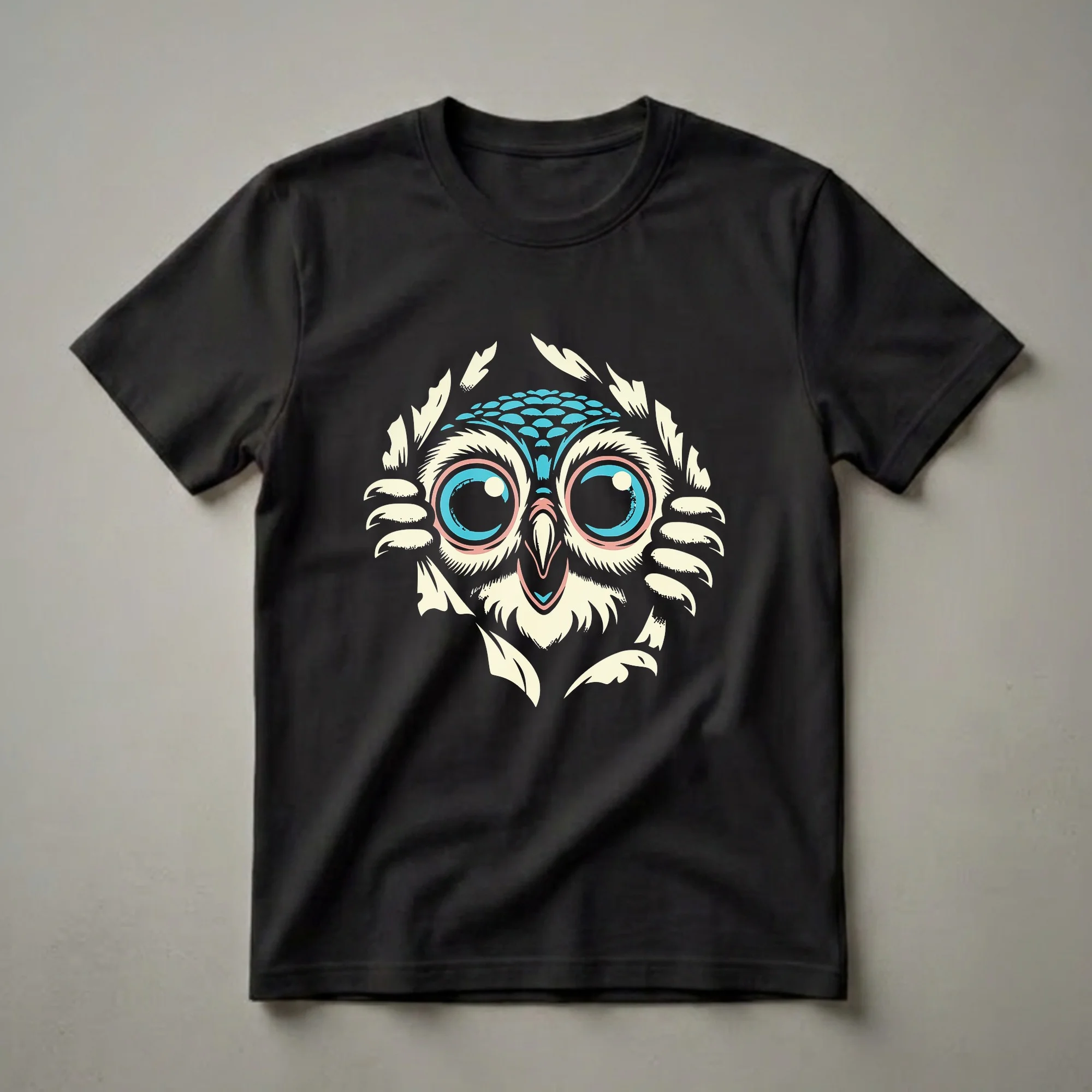 Owls, known for their nocturnal habits and distinctive calls, are often depicted as wise creatures, but this graphic tee offers a humorous twist. This eye-catching design features a stylized owl's face peeking through abstract shapes, rendered in a striking palette of cream, blue, and pink against a black background. The large, wide-set eyes and curious expression give this owl a playful personality, making it a conversation starter. This t-shirt is a thoughtful gift for friends who appreciate witty animal humor or anyone who enjoys unique graphic apparel. It's a go-to tee for casual outings, game nights, or just lounging around. The bold artwork ensures you'll stand out, whether you're out with friends or enjoying a quiet evening. This shirt is a fun way to express your personality and love for all things quirky and avian. It’s a staple in any collection of humorous animal shirts, offering a unique visual appeal that’s sure to bring a smile.